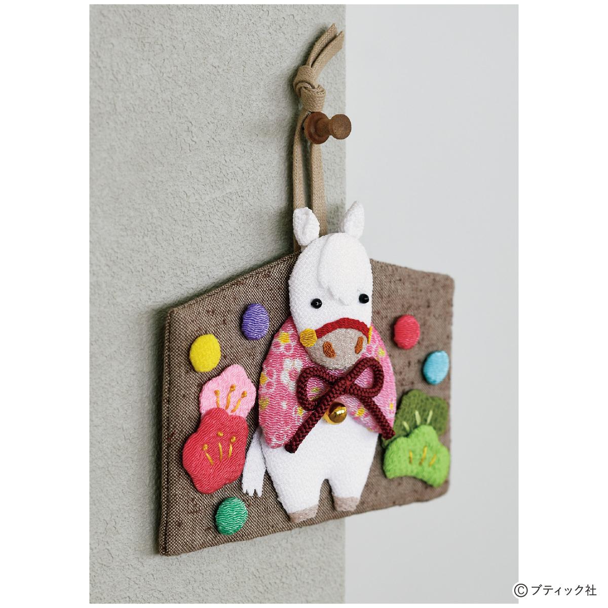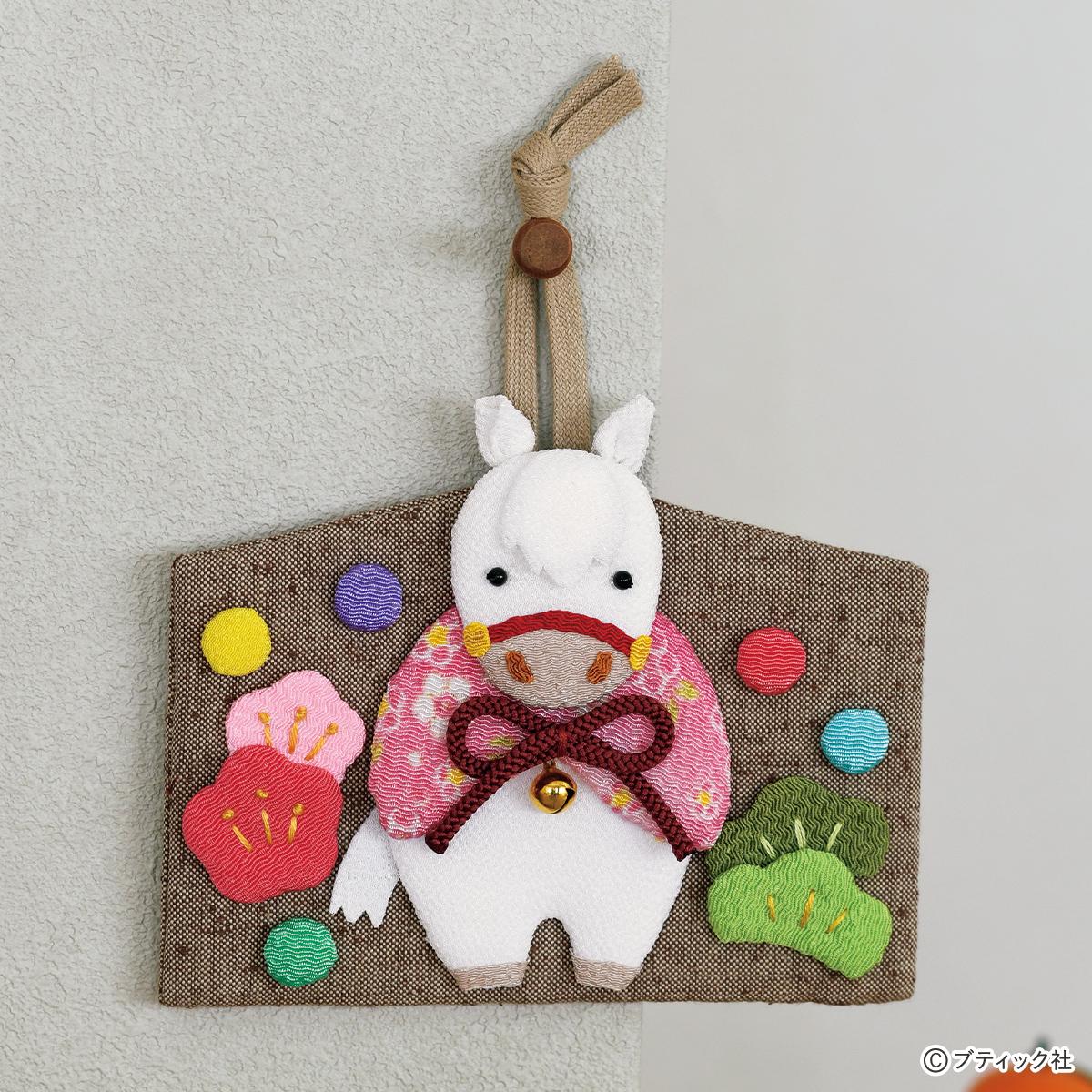 「物事がうまくいく」「幸運が駆け込んでくる」といった意味合いから、午年は縁起の良いことが起こりやすい年とされています。久留米織の無地の絵馬に、ちりめんで作った白馬や松、梅を押し絵風にあしらいました。見ているだけで幸せな気持ちにさせてくれる可愛いお飾りです。