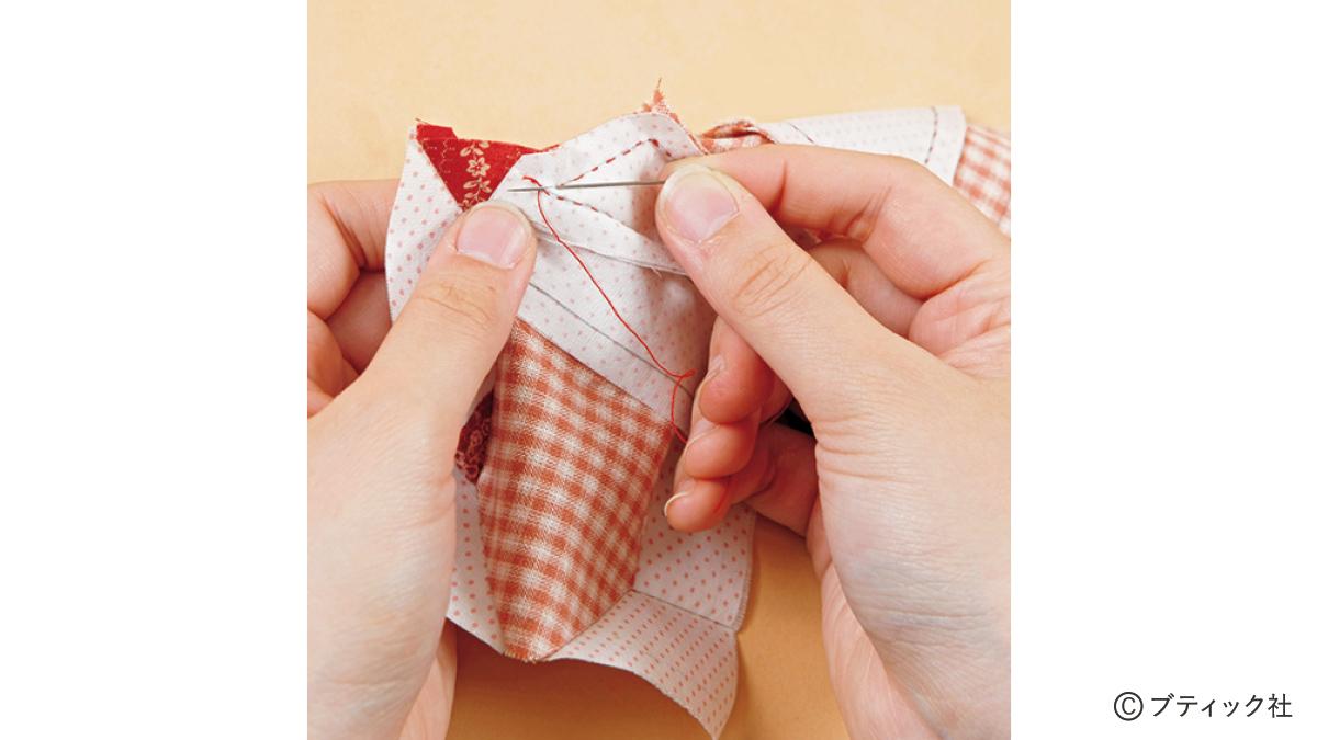 11 胴のブロックを上にして中表に重ねて、05を参照して一辺目を留めて角まで縫います。角ではひと針返し縫いし、二辺目も同様に。次に縫い代に針をくぐらせて次の辺に針を出します。はめ込み縫いで角をまち針で留めるときは縫い代をはねて。