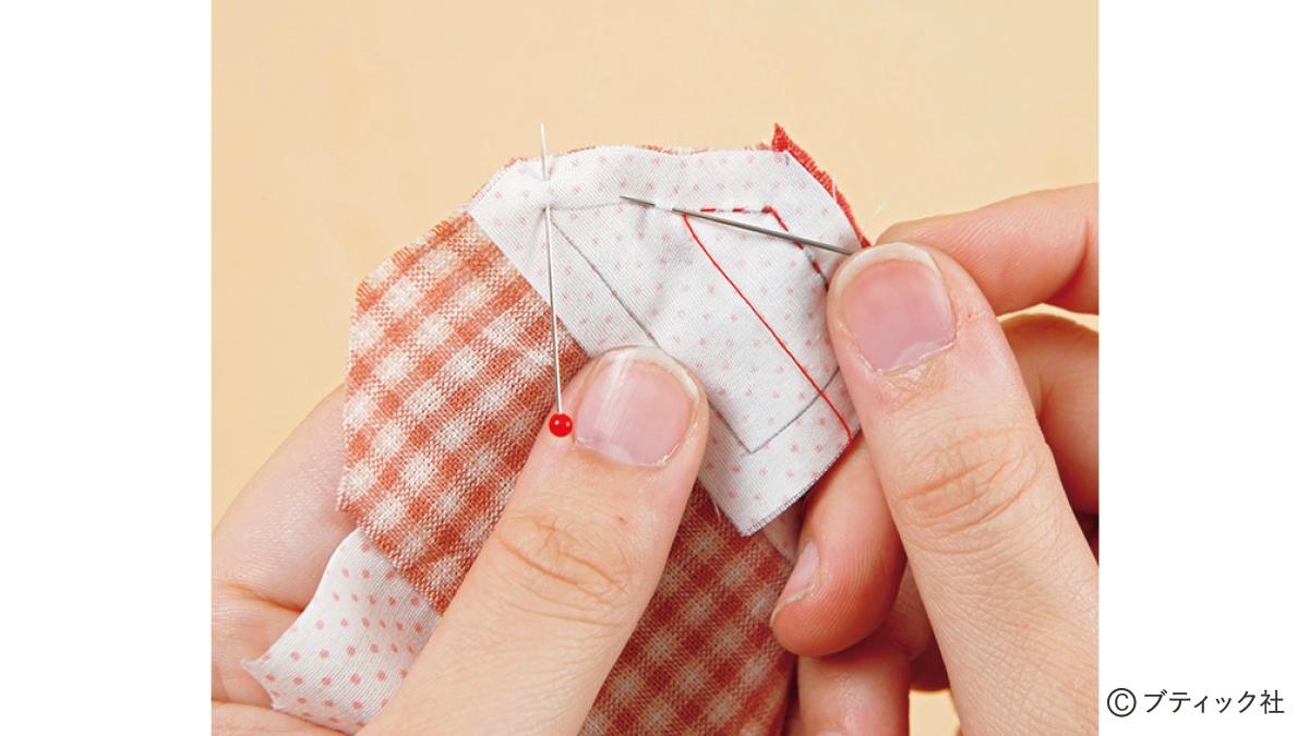 05 中表に重ねて一辺目を合わせ、印の角と中心をまち針で留めます。布端から角までぐし縫いし、角でひと針返し縫いしましょう。