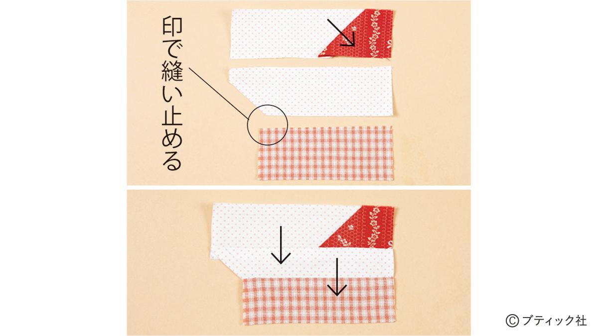 06 糸を切らずに針を休め、二辺目の印を合わせて両端の角と間をまち針で留めます。Bの縫い代をはねてCのみと留めて。角から布端まで縫い、縫い代はモチーフ側に。