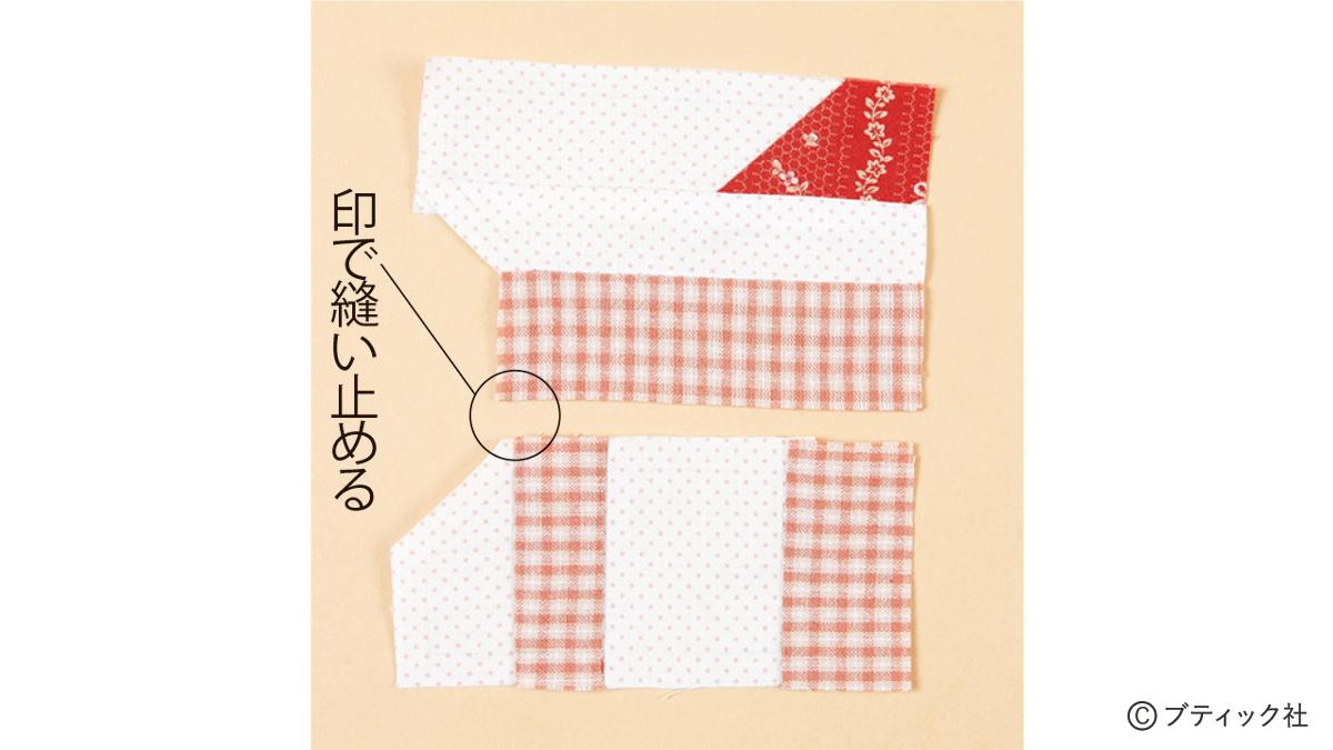 09 胴と足の小ブロックを接ぎます。並べて縫う位置を確認し、布端から印までぐし縫いします。縫い代は胴側に片倒しします。