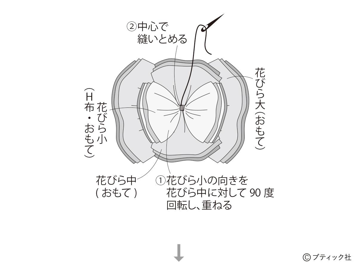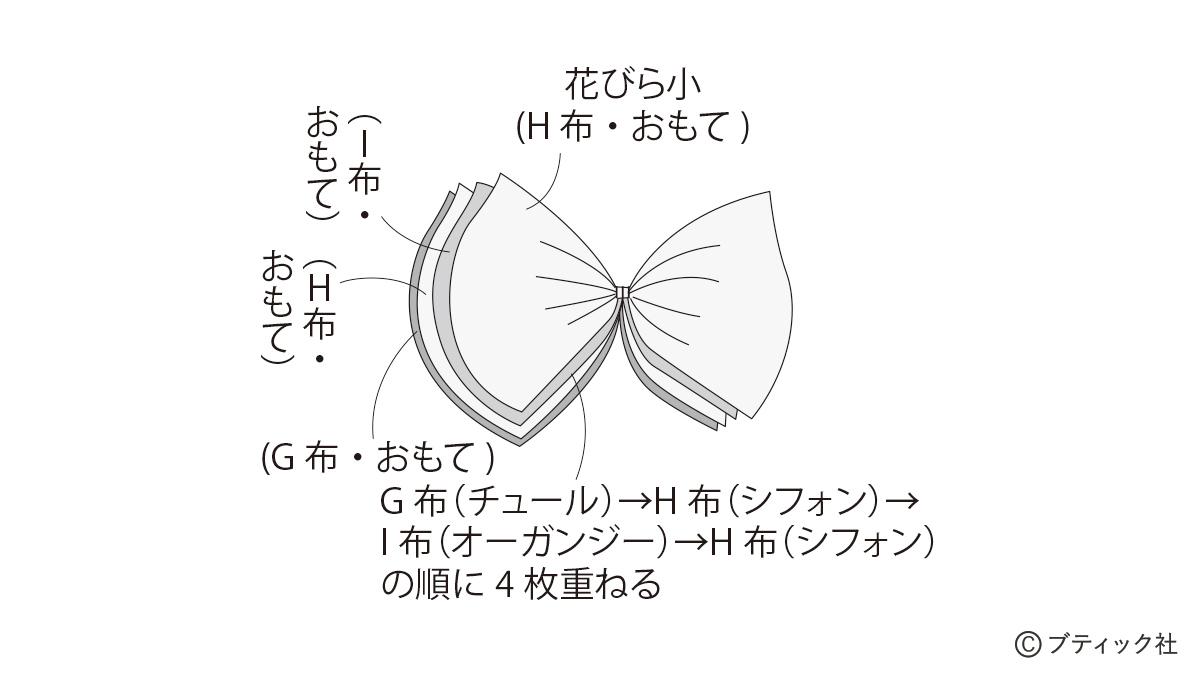 縁起の良い牡丹の花に似ていて、花が少ない冬季にも美しく咲くことから、牡丹の代わりとしてお祝いごとなどに使われるようになった葉牡丹。さまざまな薄手の透ける布を四角くカットし、各色たたんで重ねました。平たい形の花器などに飾ると素敵です。