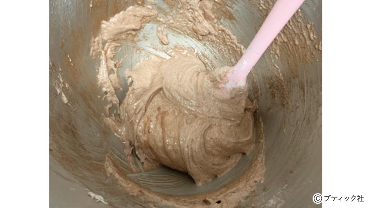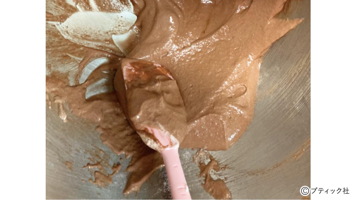 03 02は3回に分けて加え、その都度ゴムベラで下からすくい上げるように混ぜる。