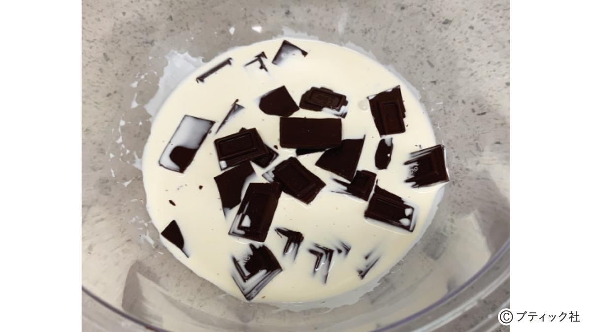 耐熱ボウルに生クリームを入れ、板チョコ(ブラック)を割り入れる。