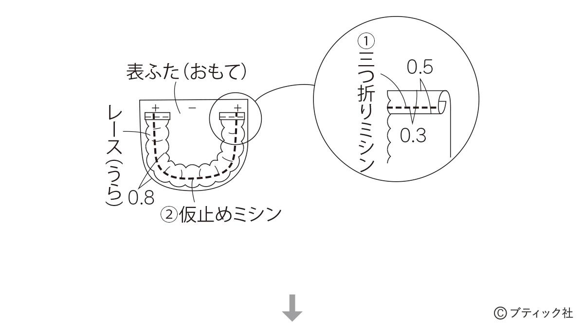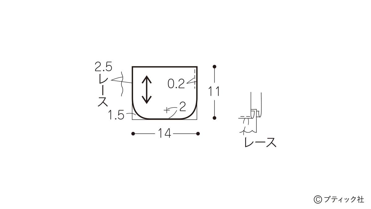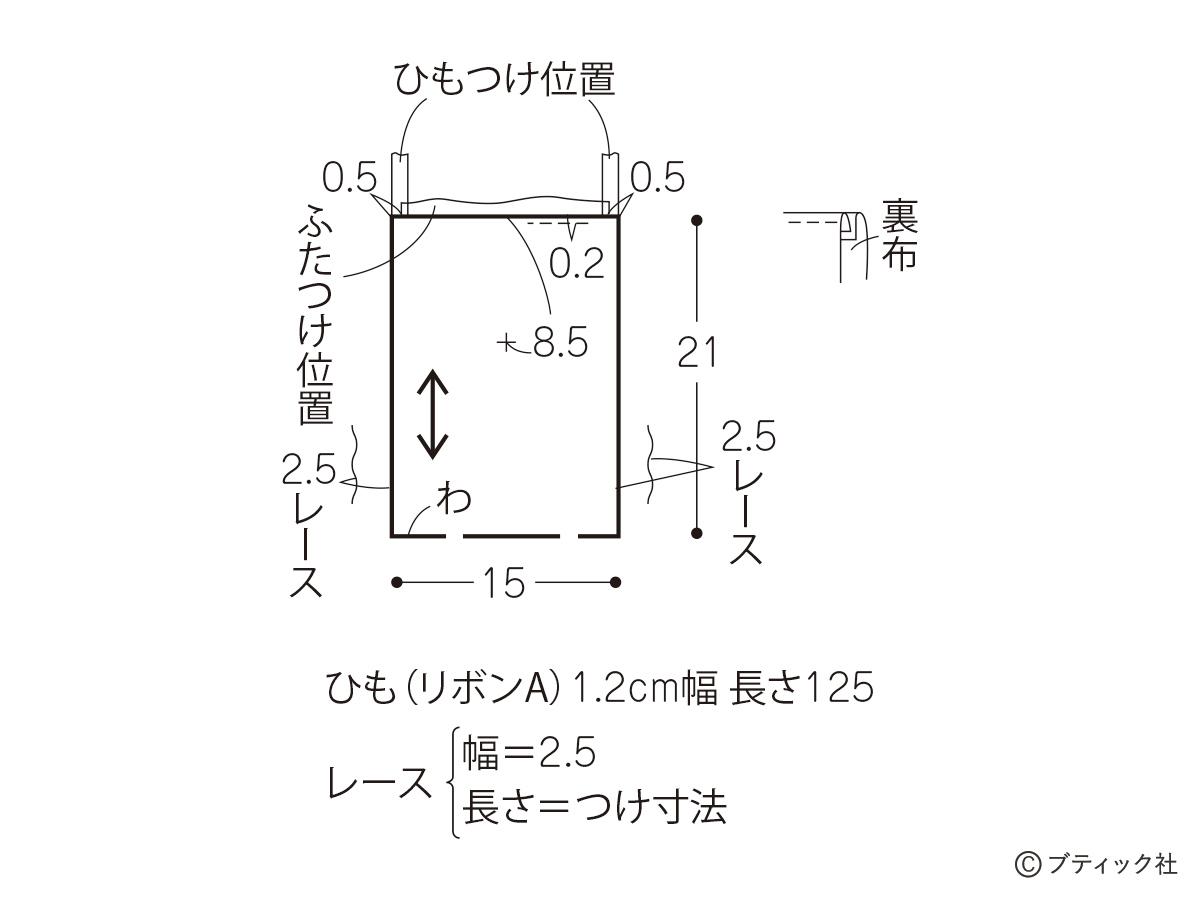 サイドとふたはラッセルレースでおめかし。布地と同じ色のベルベッドリボンをあしらいました。