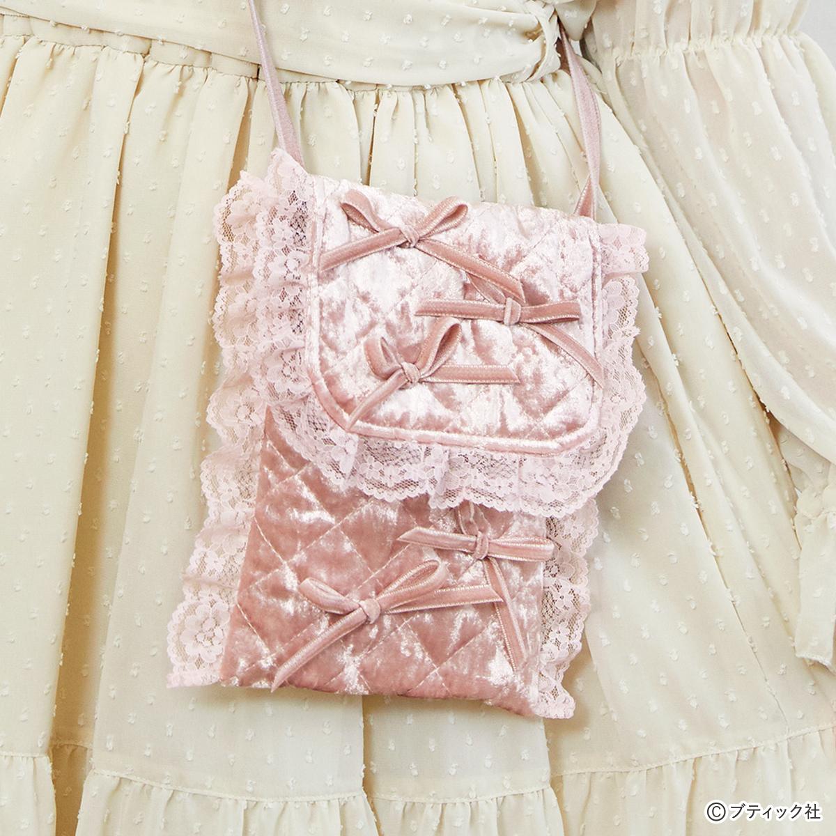 ベロアキルティングを使ったスマホポシェットは、落ち着いたダスティーピンクと繊細なレース使いがクラシカルな雰囲気。ワントーンコーデの差し色として、優雅な雰囲気をプラスします。