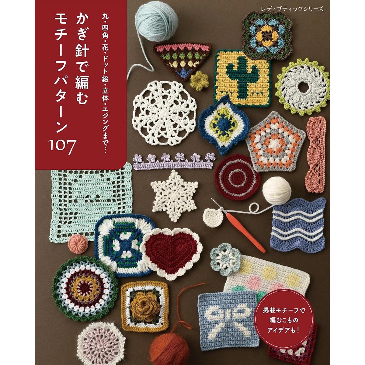 「かぎ針で編む モチーフパターン107」では、今回紹介したレシピ以外にもたくさんの編み込み模様のレシピをわかりやすく丁寧に紹介しております。