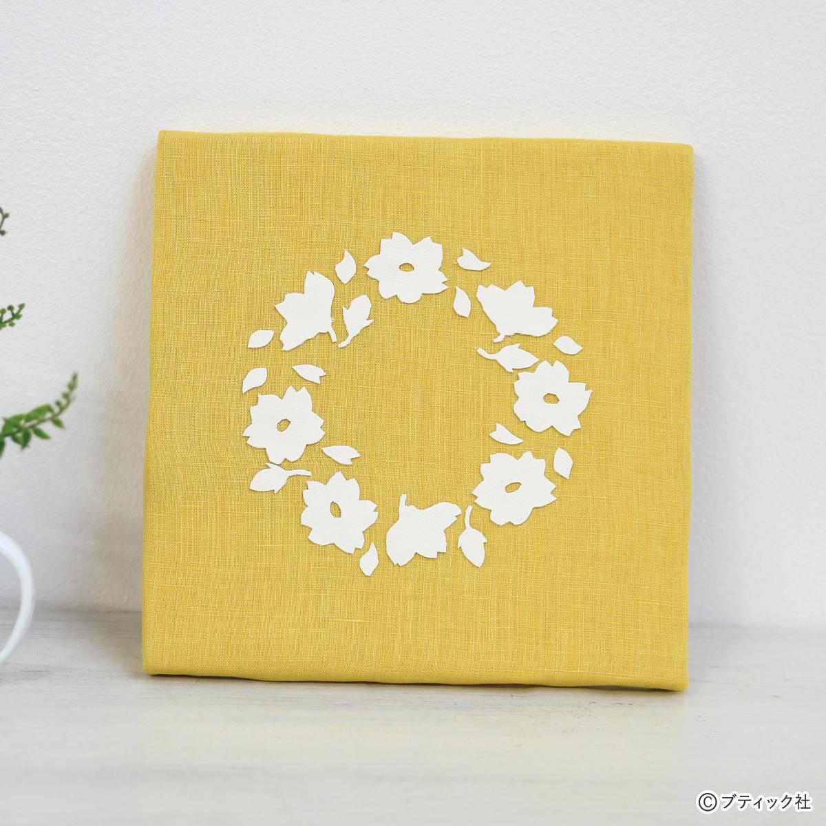 花言葉は“希望”。春を待って咲き始める白いアネモネの花をモチーフにしたファブリックパネルです。裁ち切りでもほつれにくい合成皮革を花型にカットし、綺麗なイエローの土台の上にリース状に並べました。サイズは15cm四方と小さめなので、手軽に模様替えを楽しめます。