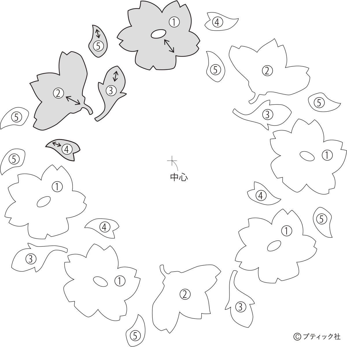 02 図案を参考に、花①~⑤の順に貼る(大きいパーツから貼る)