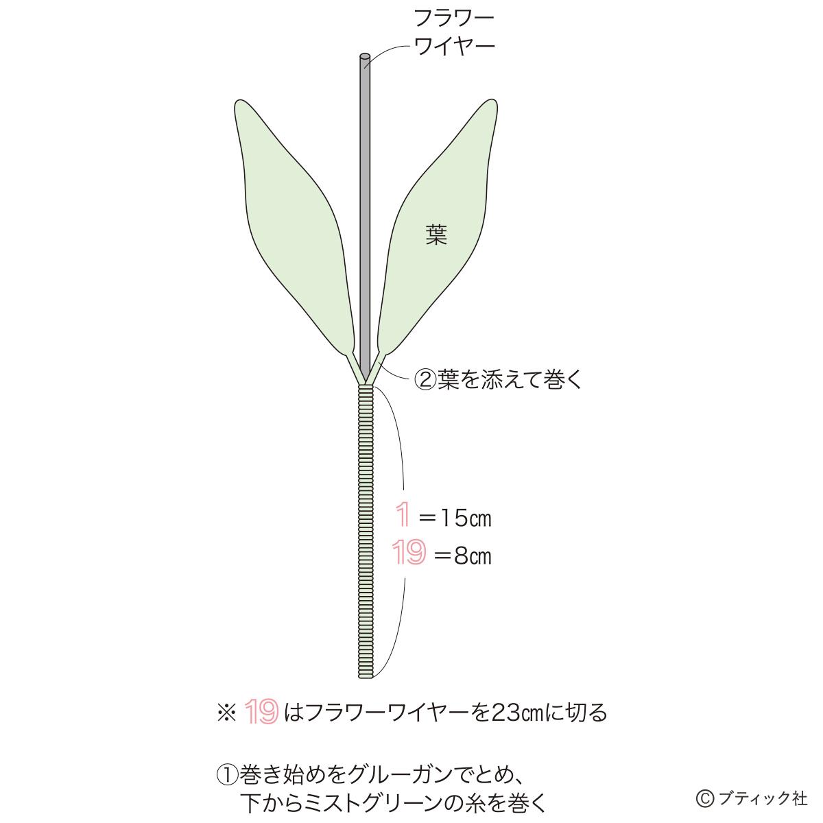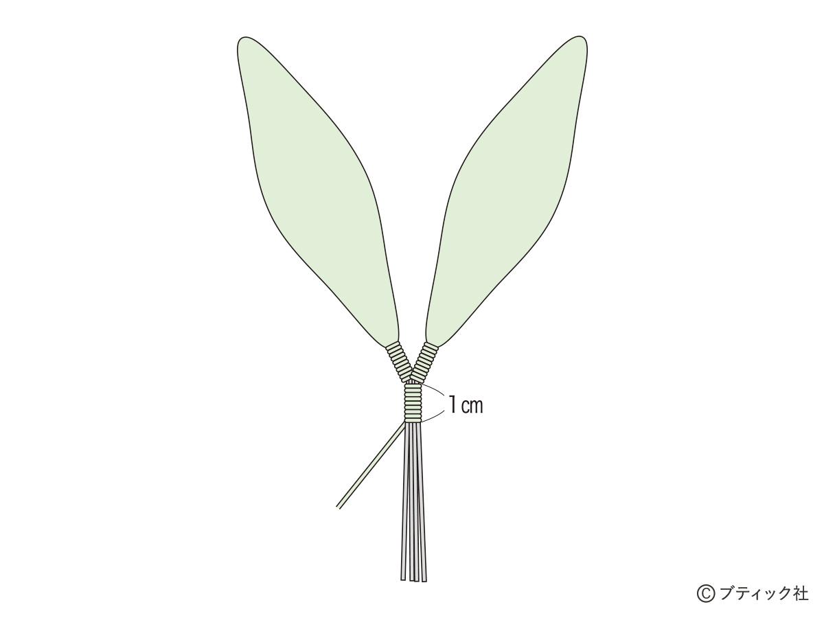 02 2枚の葉のワイヤーをミストグリーンの糸で1cm巻く