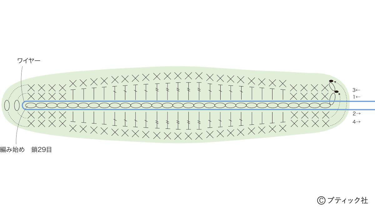 編みはじめの糸は始末し、編み終わりの糸はワイヤーに1cm巻く。