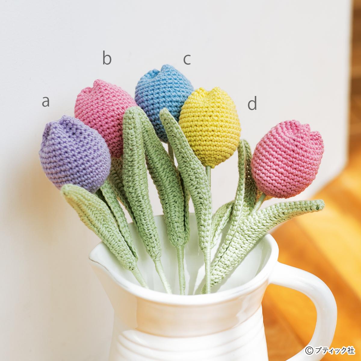 a=ラベンダー、b=ローズピンク、c=ベビーブルー、d=ライムライト 4/0号かぎ針