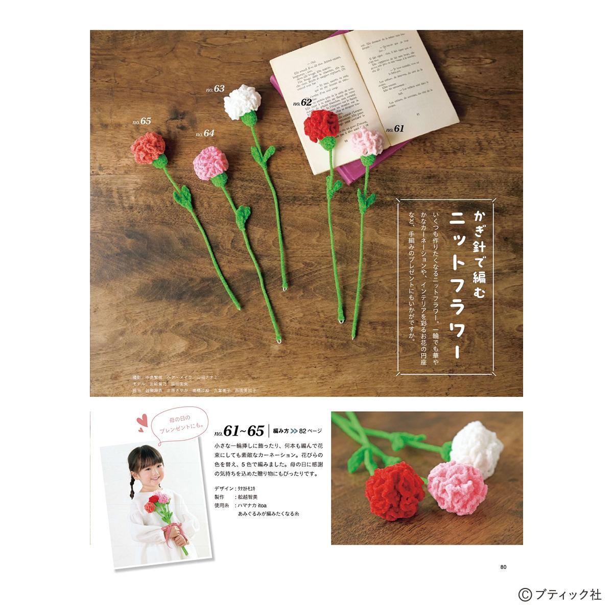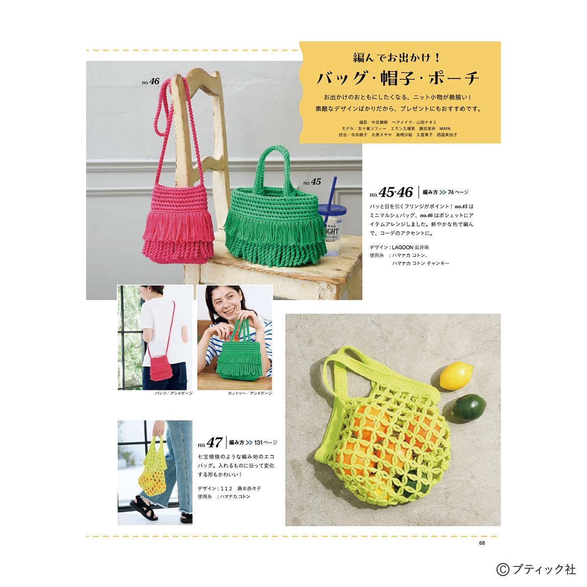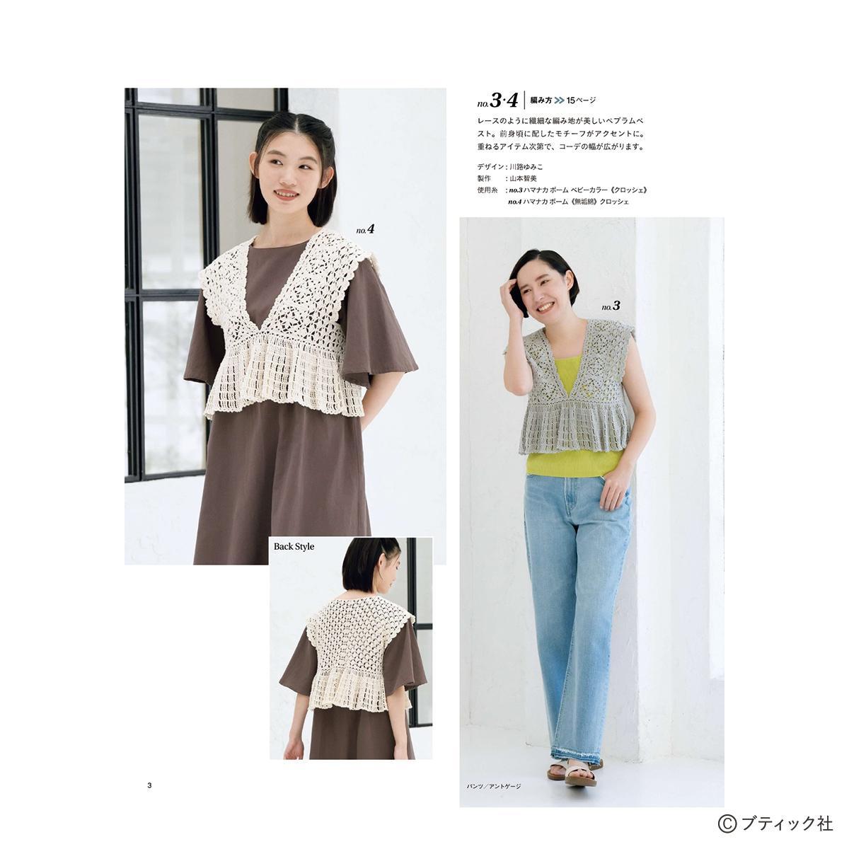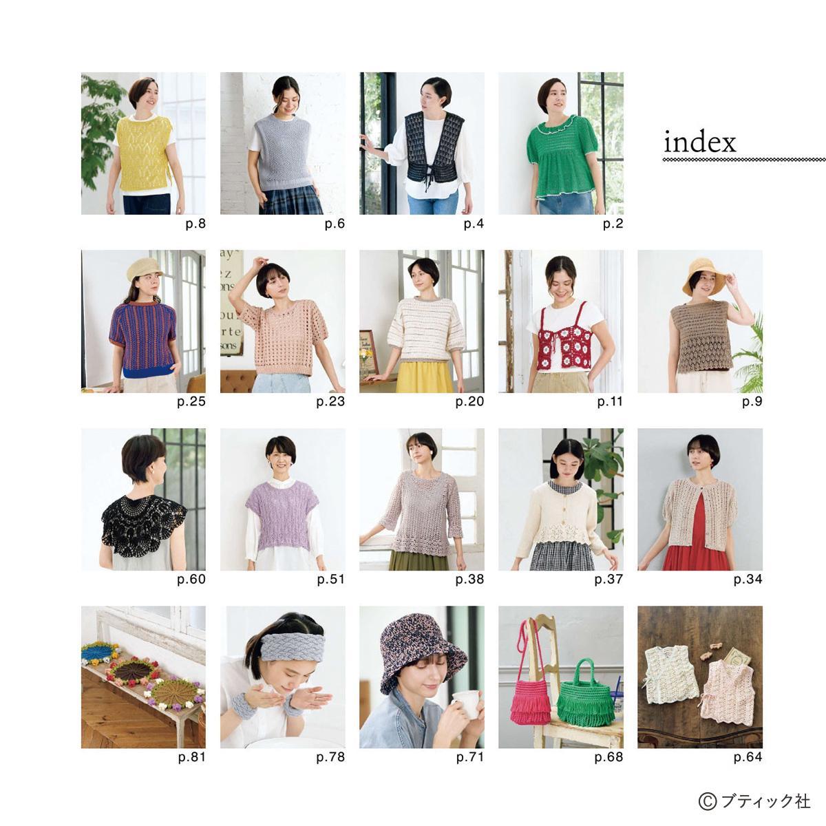 春夏に着たいプルオーバーやベスト、羽織りものなど、ウエアを中心に、バッグや帽子などのこものも掲載。かぎ針編みブームを意識したビスチェ、ニットフラワーなどトレンド要素も満載。長年の手編みファンから若い世代まで、幅広く楽しめる1冊。