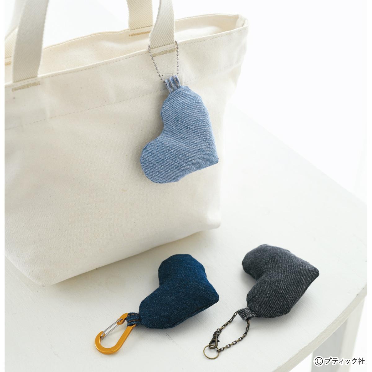 手芸わたをを入れてふっくらとさせたハート型のチャームです。カラビナをつけるループにはジーンズのベルト通しを使って。お好みで金具を替えて使いましょう!