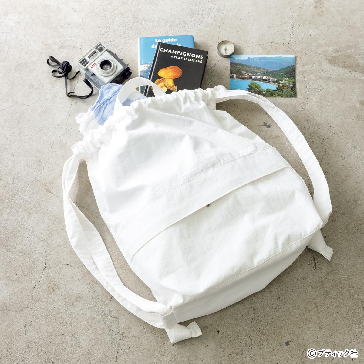 色々な場面で活躍するバッグ!雑誌に掲載すると大人気だったのがこのナップサック。真っ白なコットンナイロン生地で仕立てたので、洋服に合わせやすく使いやすいです。