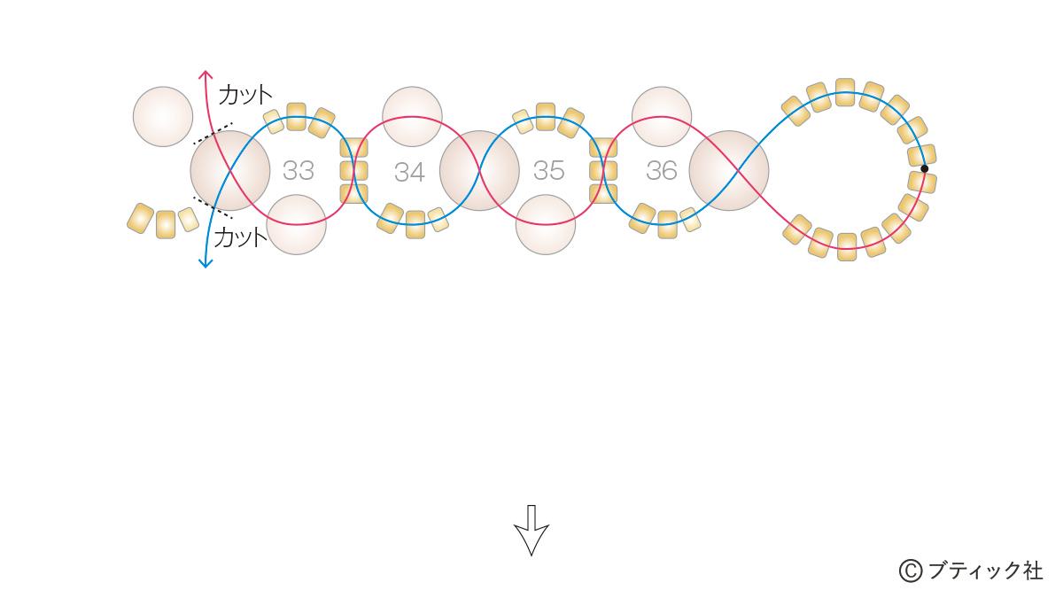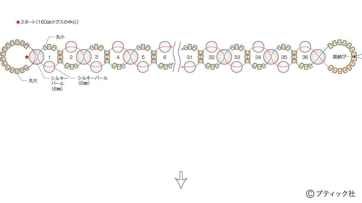 01 160cmにカットしたテグス(6号)の中心からスタート(★)。図を参考にし、端まで編む。