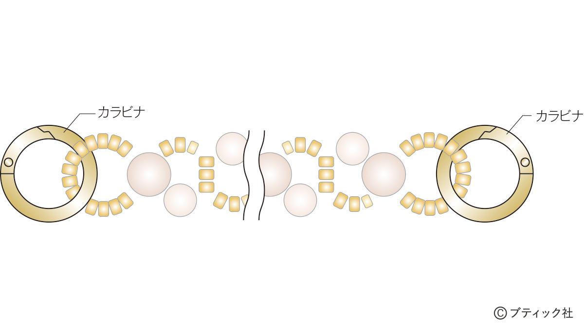 01 200cmにカットしたテグス(4号)の中心からスタート(★)。図を参考にし、編む。編み終わりは固結びをし、3模様ほど通し戻してから余分なテグスをカットする。両端にカラビナを通す。
