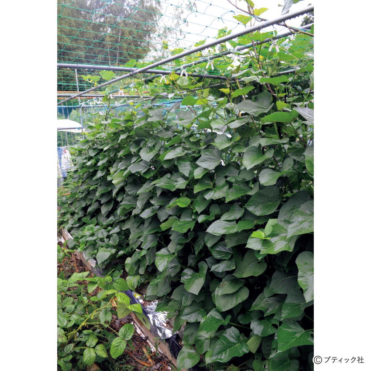 園芸ネットにツルを誘引している例。サツマイモは自分ではツルに這い登らないため、麻ヒモなどでツルをこまめにくくって誘引する手間がかかるが、おいしいイモがどっさり採れる。