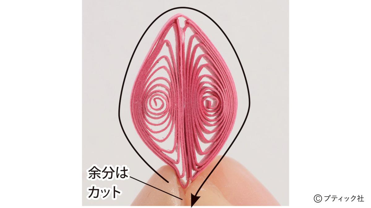 03 パーツの側面に糊づけしながら、01で貼った紙で外周を巻きます。巻き終わりの余分はカットします。花びらのできあがり。