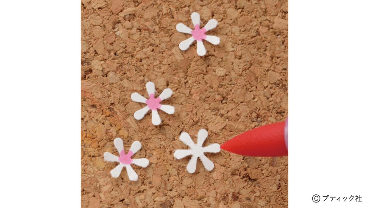 05 花芯の色紙をクラフトパンチアスタリスク型で18枚抜き、中心にアルコールマーカー(ピンク)で丸を描きます。