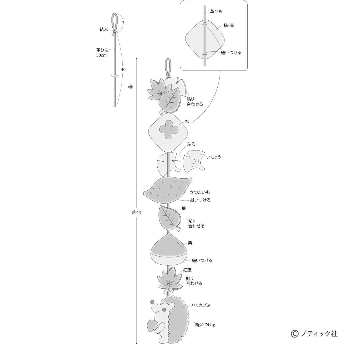 四季をモチーフにした、おしゃれな吊るし飾りのレシピ。ここでは、美味しそうに実った柿、さつまいも、栗を深みのある色で秋らしくまとめた1本飾りをご紹介。季節の味覚に、にっこり微笑むハリネズミさんがポイントです。