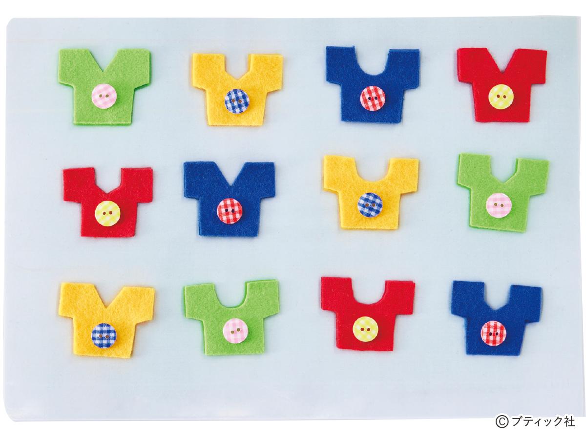 発達おもちゃの作り方と遊び方を紹介する本の中から、色や形を認識し理解できる「認知」に関するおもちゃをピックアップ!見本の服と同じ模様のフェルトの服を見つけて、見本の上に置いていく遊びです。