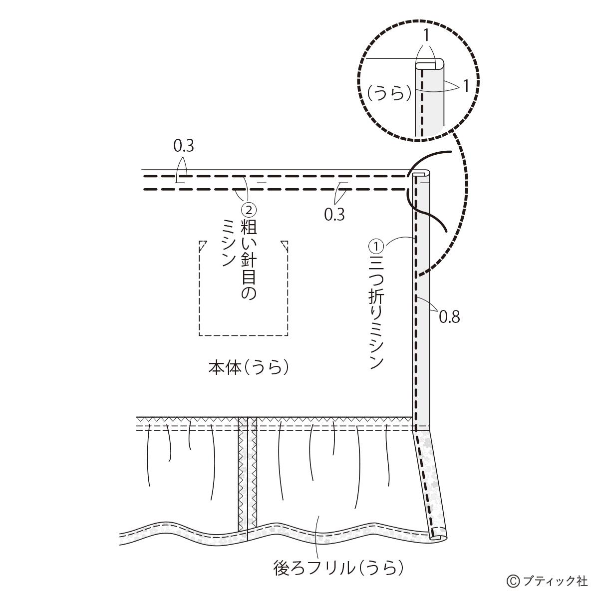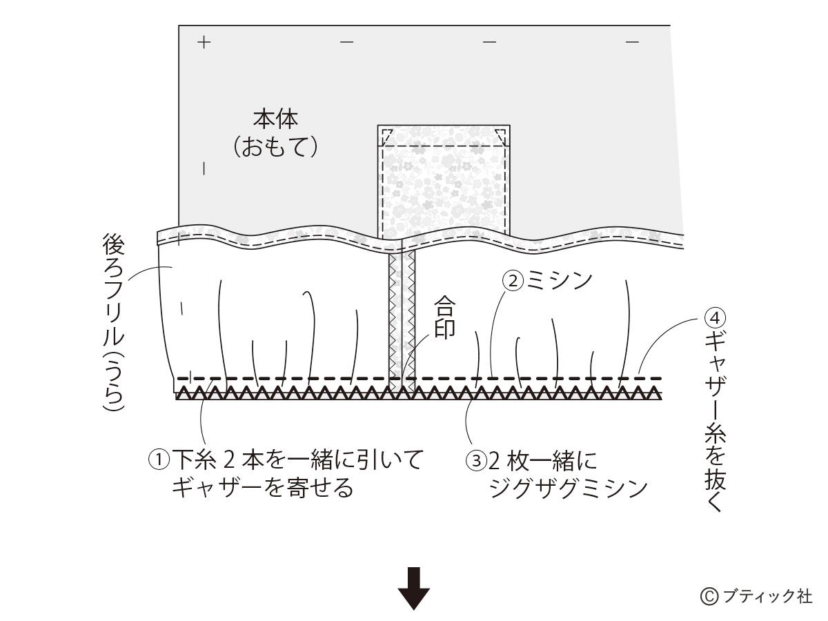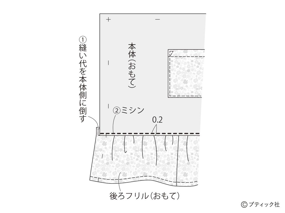 ギャザーたっぷりの別布を裾につけて甘い仕上がりに。素材は柔らかくて肌触りの良いダブルガーゼです。花柄の別布使いでアクセントを効かせて。