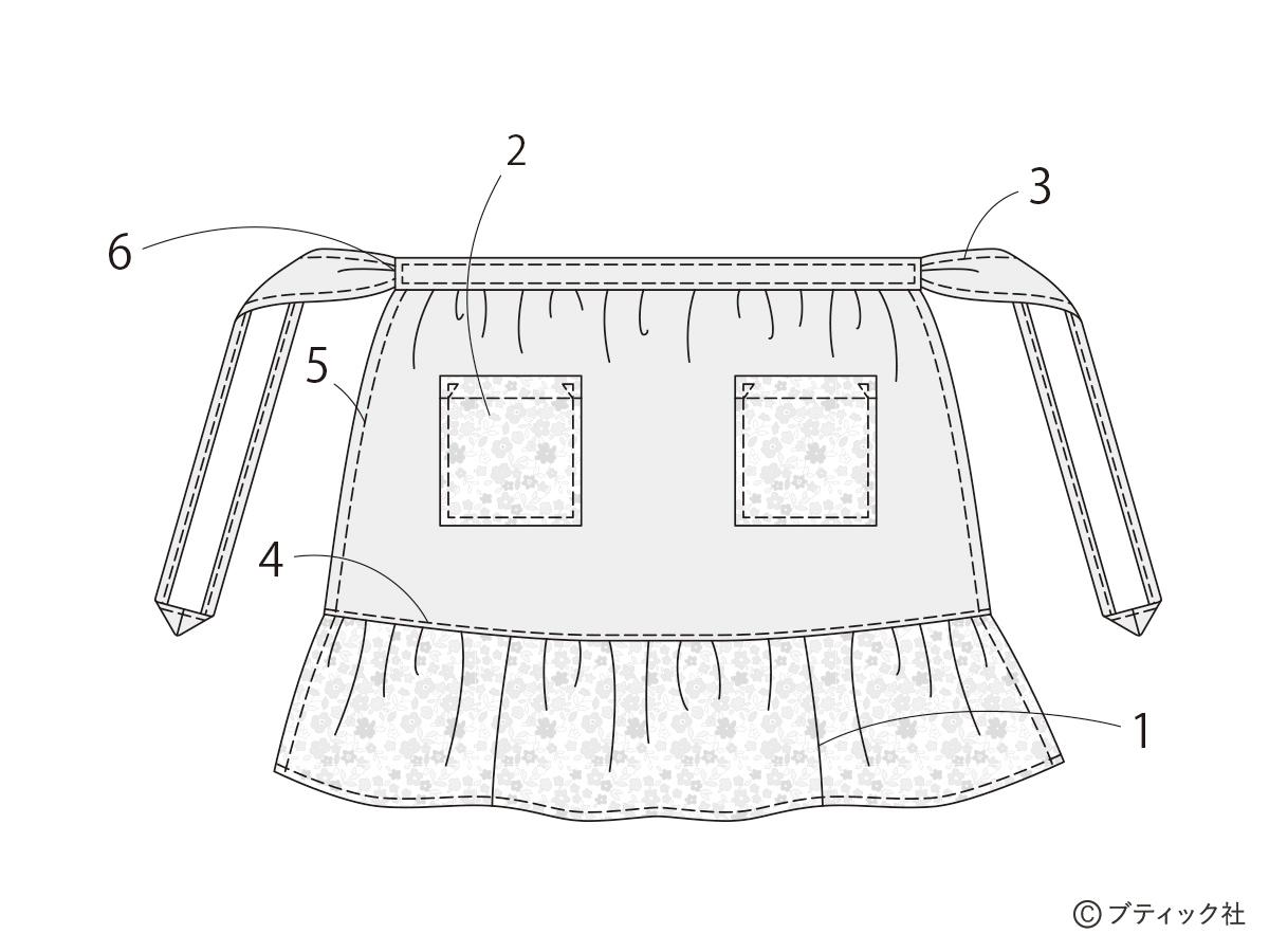 胸元のおとなしめなタックとボタンが、デザインのポイント!要所を黒で縁どりをして上品に仕立てました。何気ない家事のひとときが、手作りのかっぽう着で、少しだけ特別な時間になりそう!