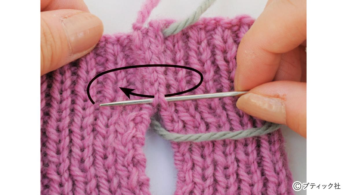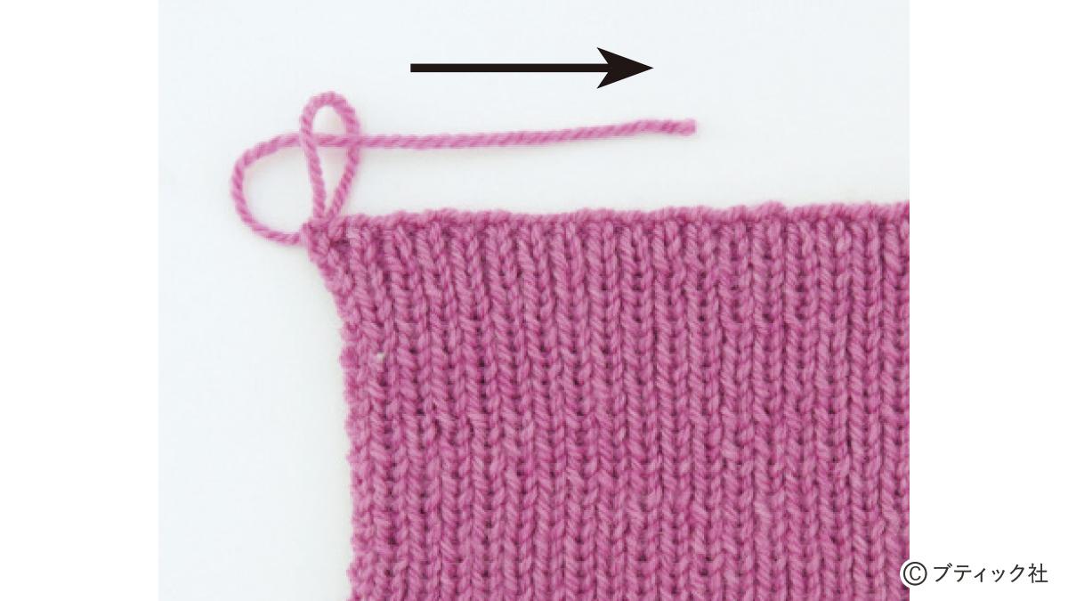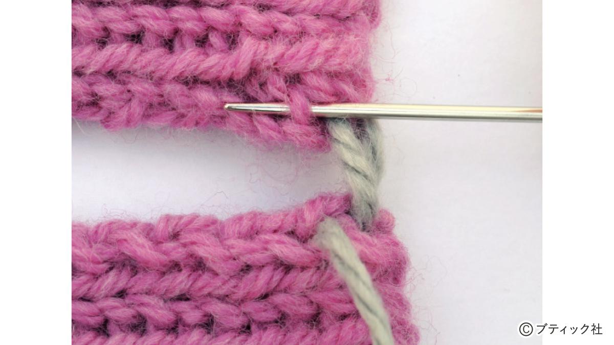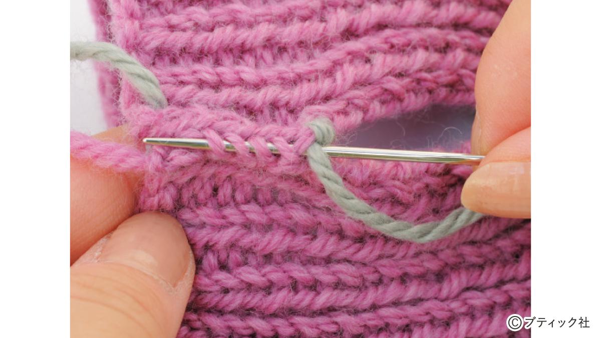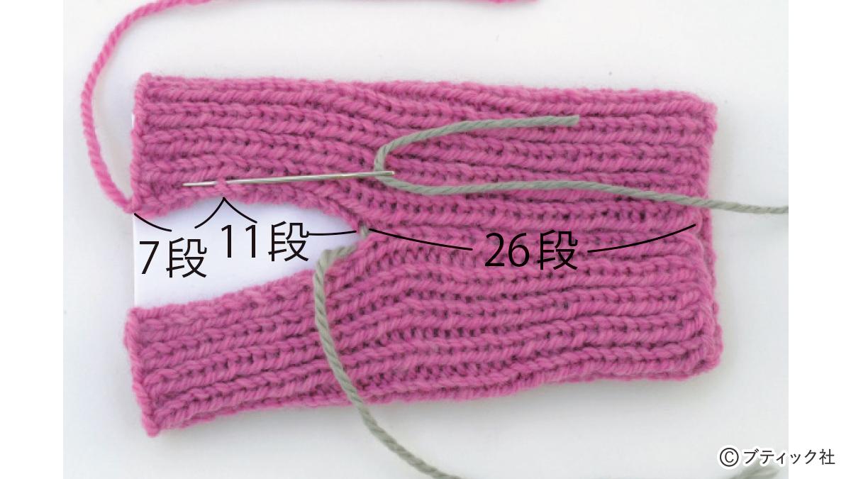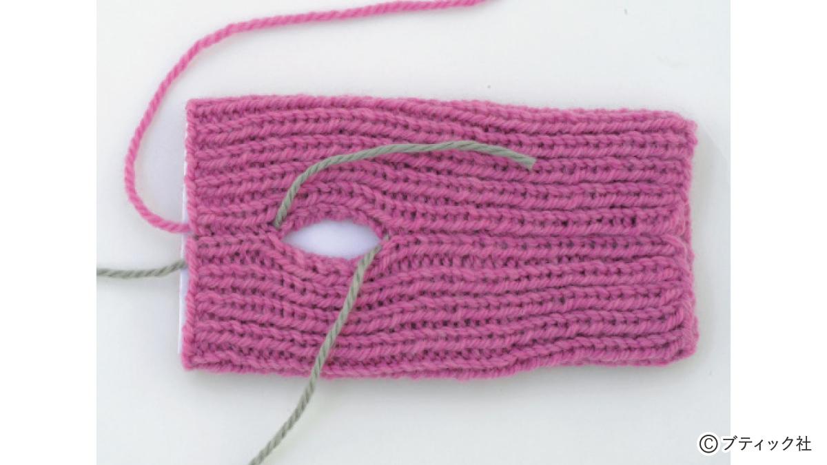 1つの段で、表目と裏目を1目ごとに交互に編んでいくのが1目ゴム編みです。伸縮性がある編み地なので、手にフィットさせたいハンドウォーマーにぴったり。往復編みした編み地の左右両端をとじて筒状にしますが、親指を出す穴を残しておくのがポイント。
