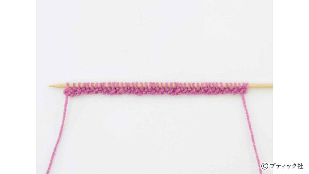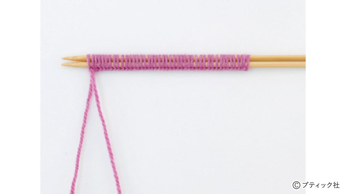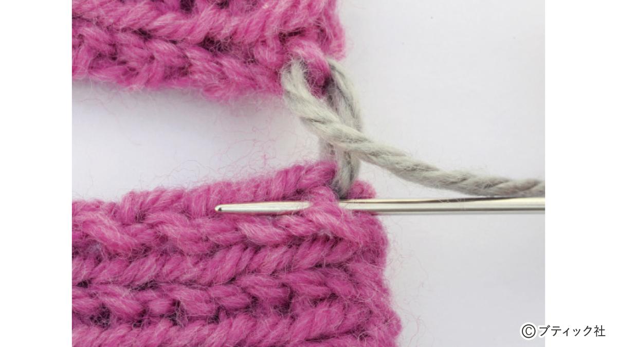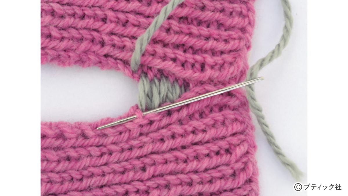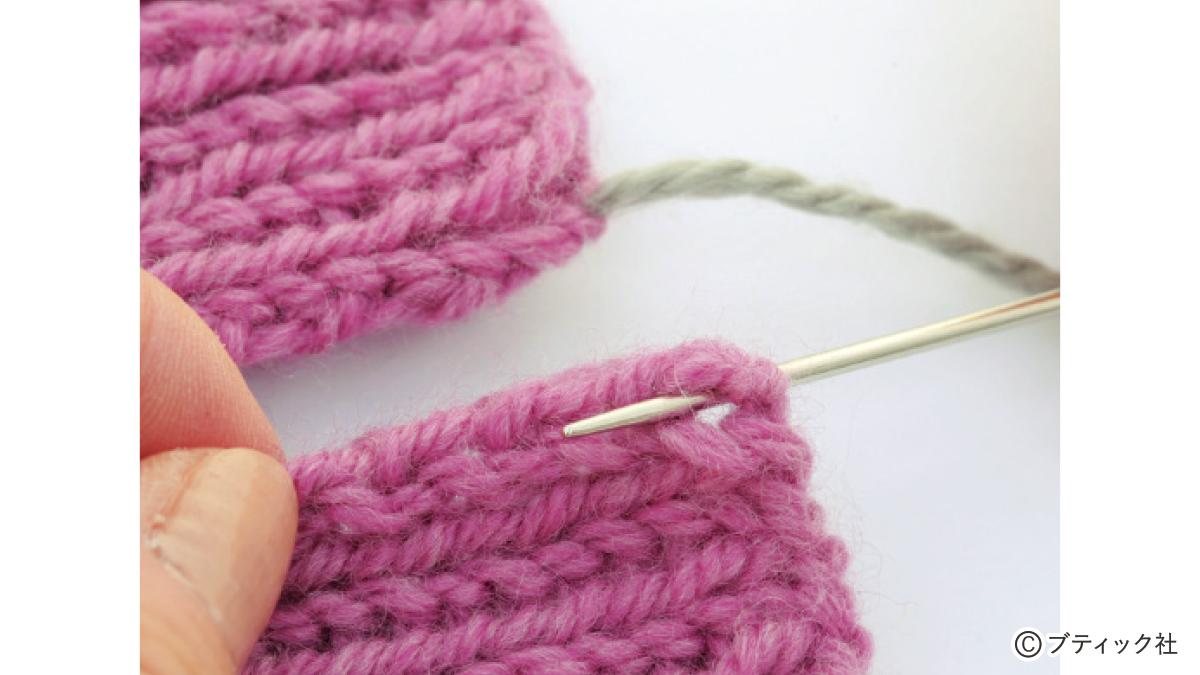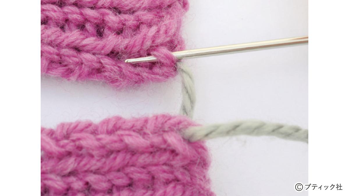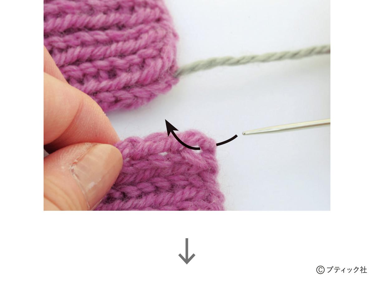1つの段で、表目と裏目を1目ごとに交互に編んでいくのが1目ゴム編みです。伸縮性がある編み地なので、手にフィットさせたいハンドウォーマーにぴったり。往復編みした編み地の左右両端をとじて筒状にしますが、親指を出す穴を残しておくのがポイント。