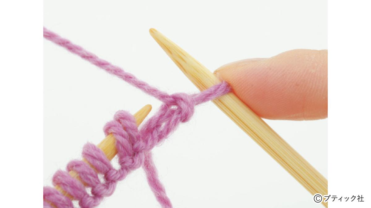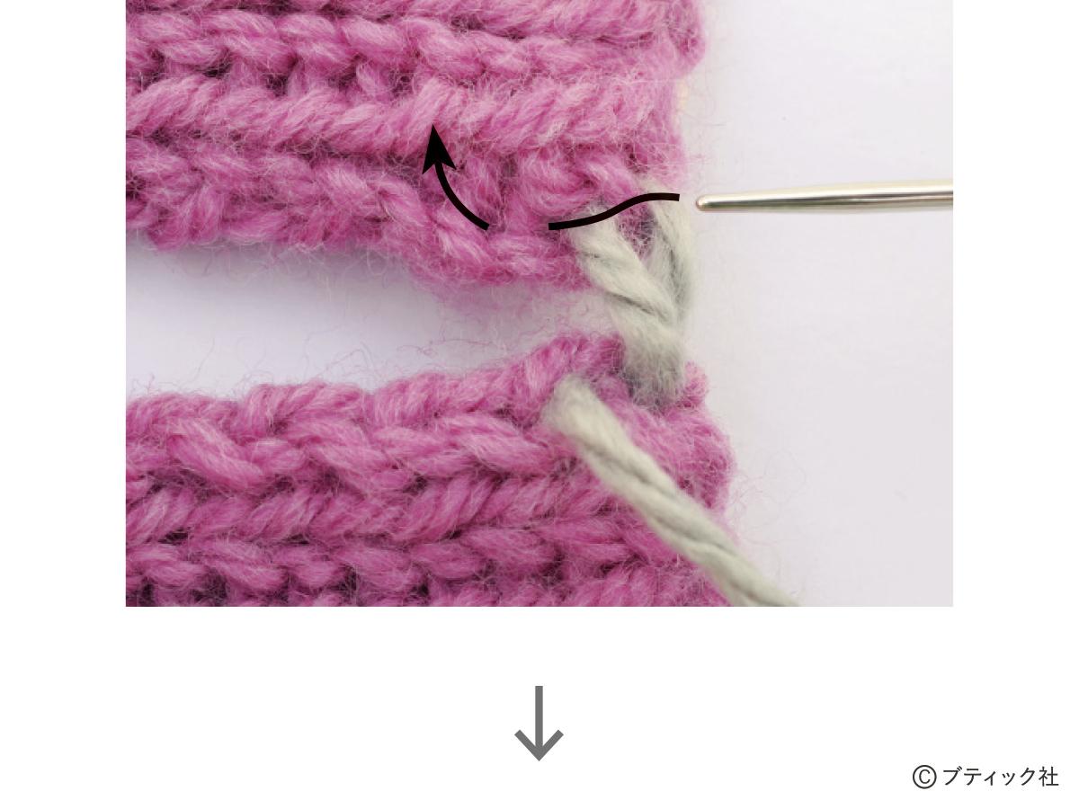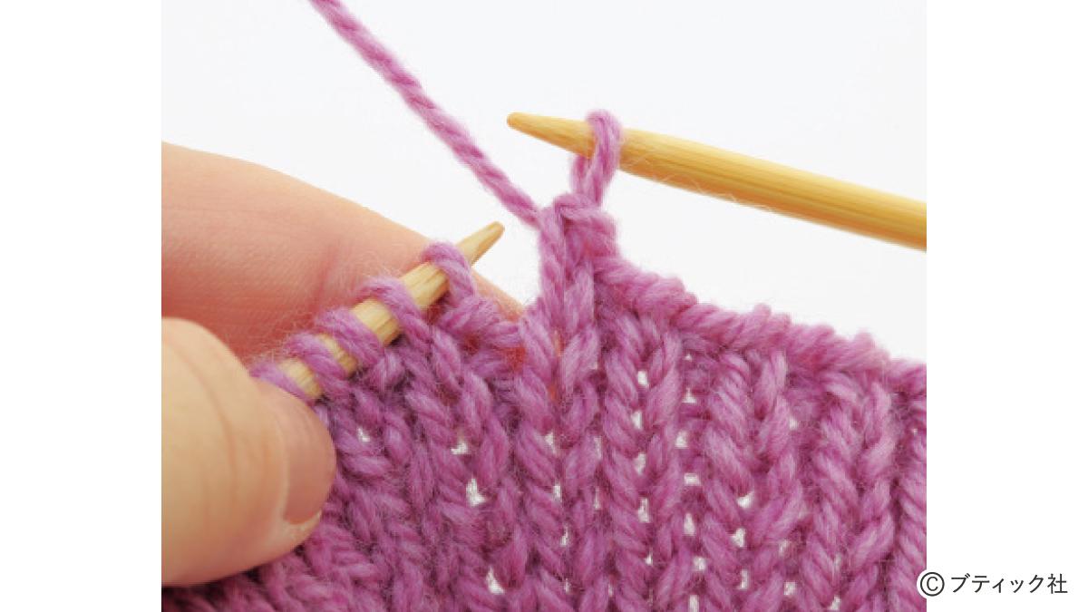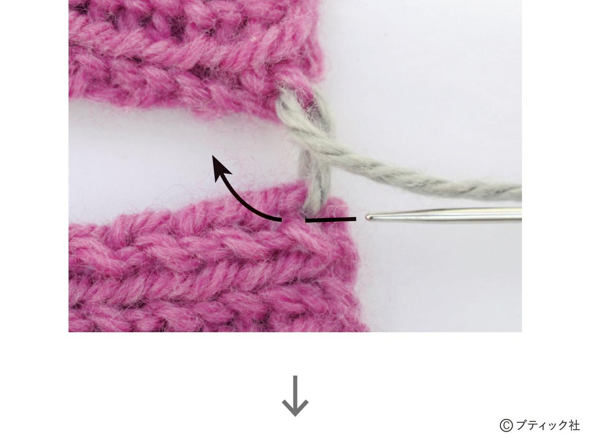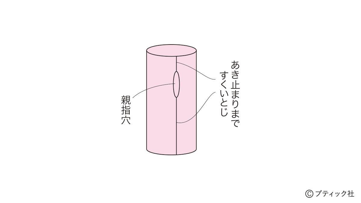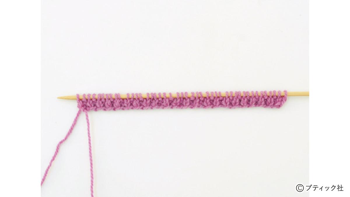1つの段で、表目と裏目を1目ごとに交互に編んでいくのが1目ゴム編みです。伸縮性がある編み地なので、手にフィットさせたいハンドウォーマーにぴったり。往復編みした編み地の左右両端をとじて筒状にしますが、親指を出す穴を残しておくのがポイント。