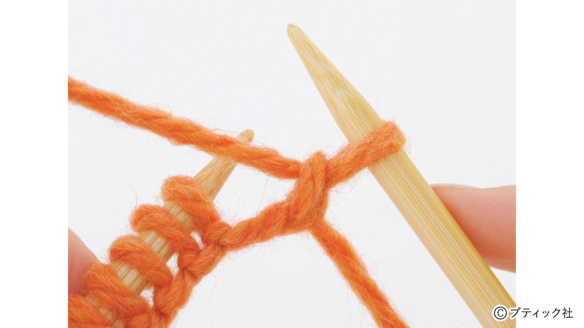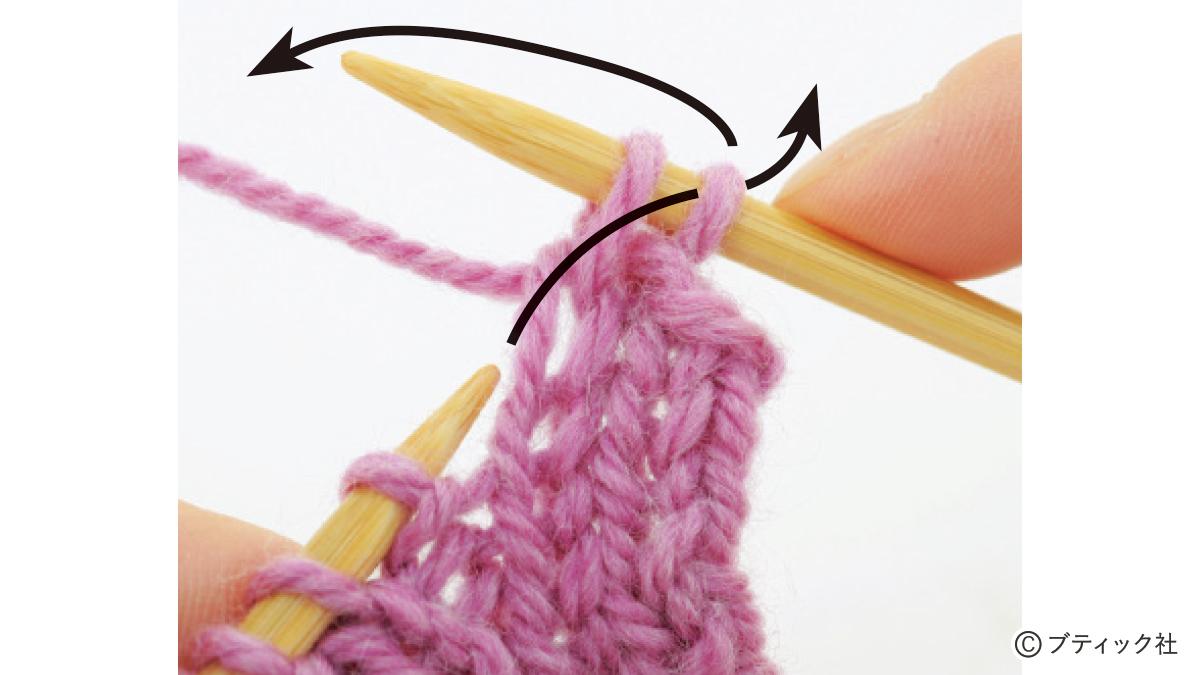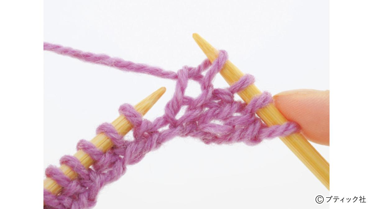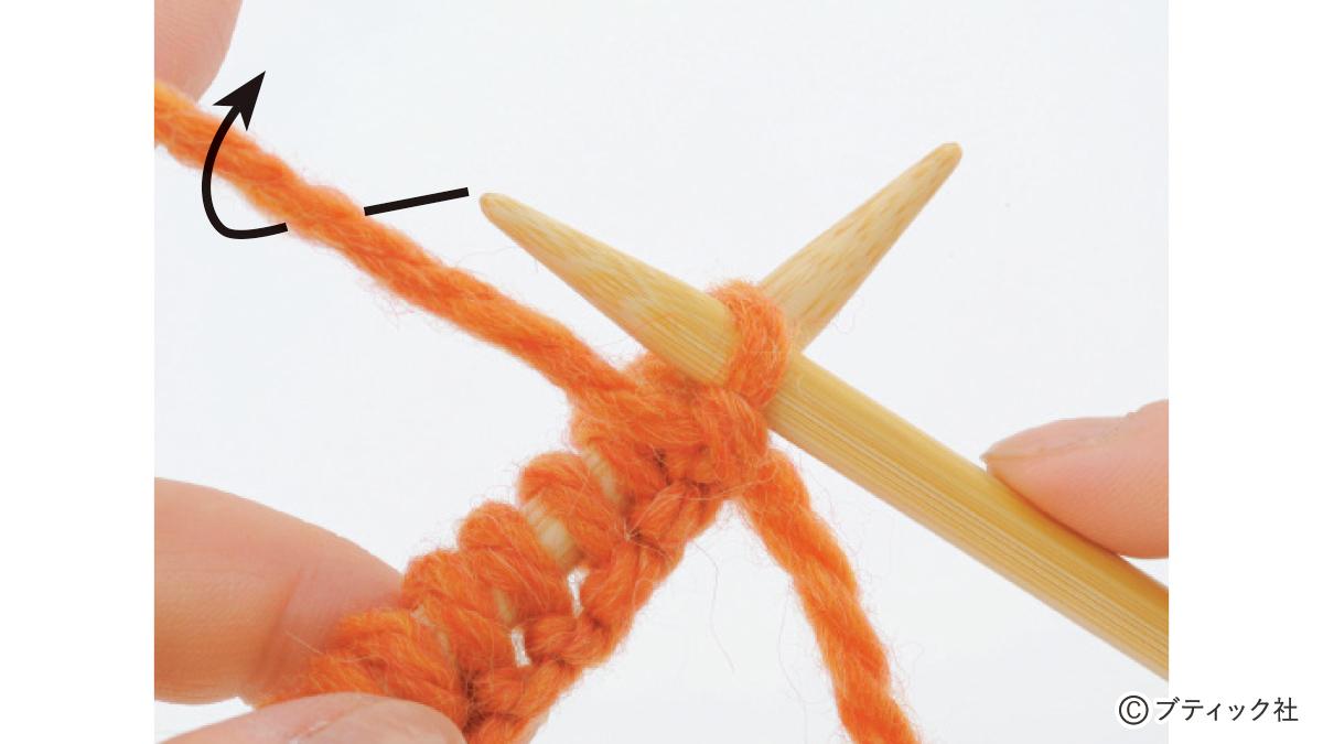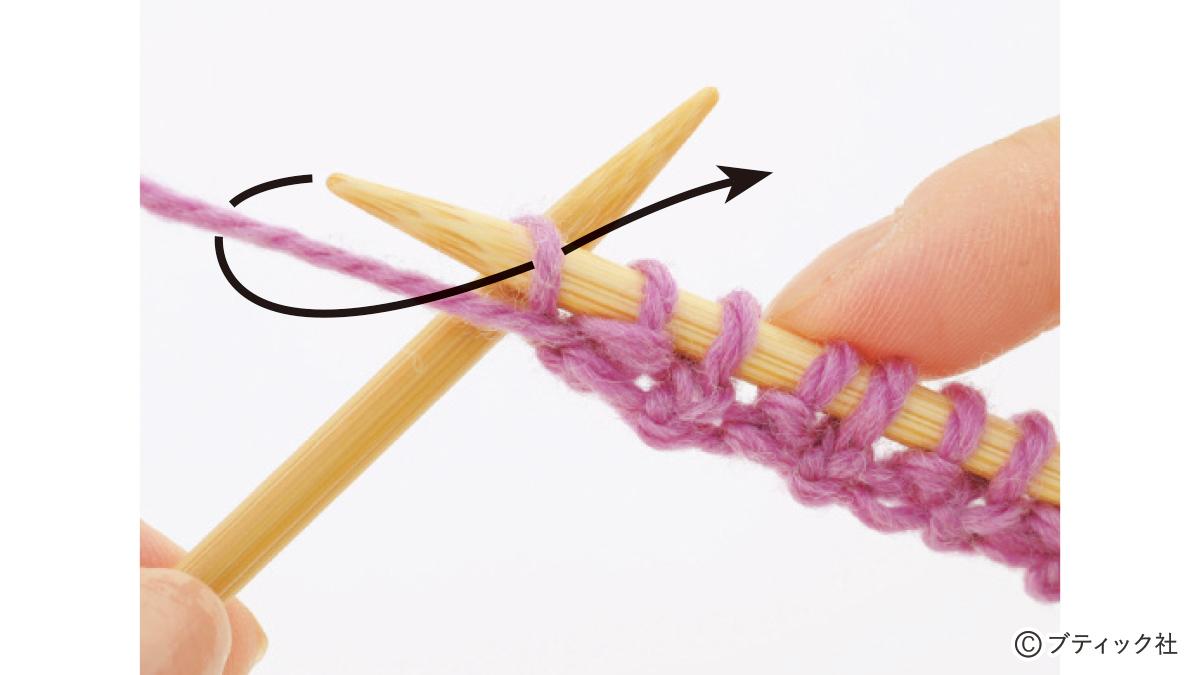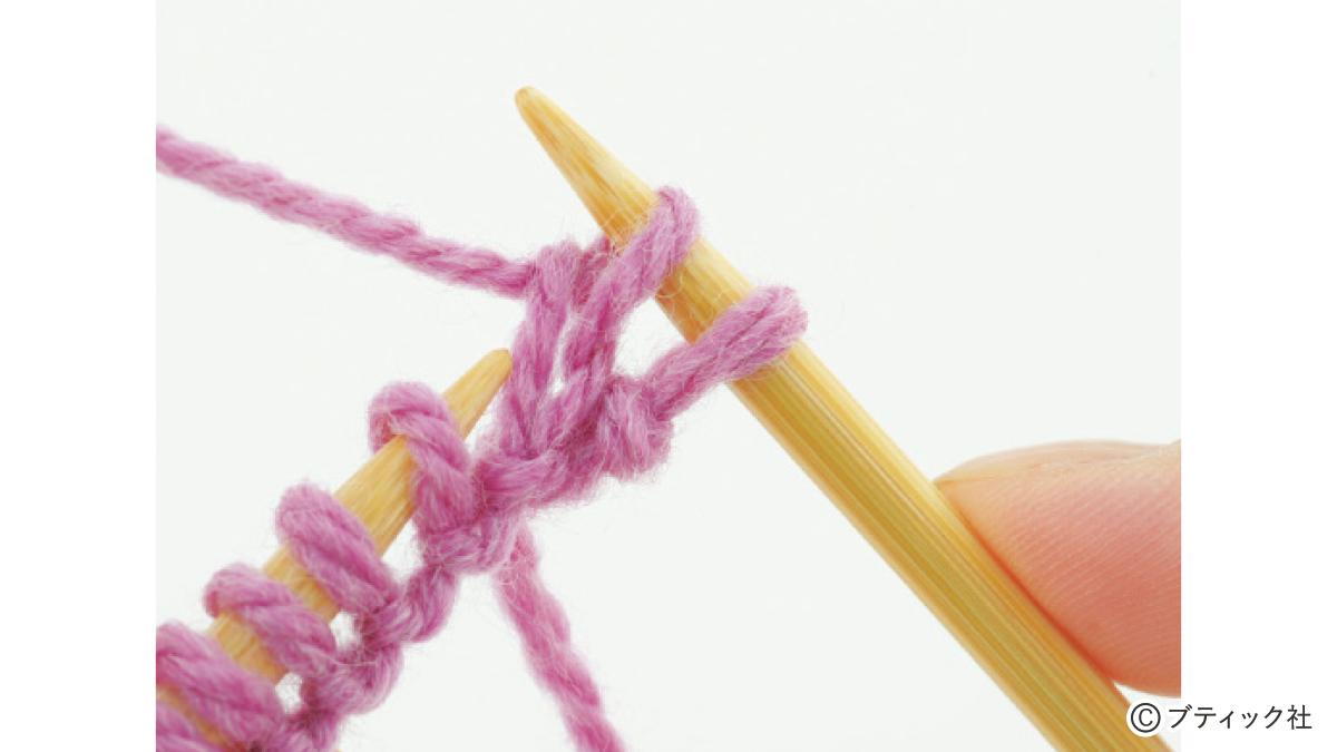1つの段で、表目と裏目を1目ごとに交互に編んでいくのが1目ゴム編みです。伸縮性がある編み地なので、手にフィットさせたいハンドウォーマーにぴったり。往復編みした編み地の左右両端をとじて筒状にしますが、親指を出す穴を残しておくのがポイント。