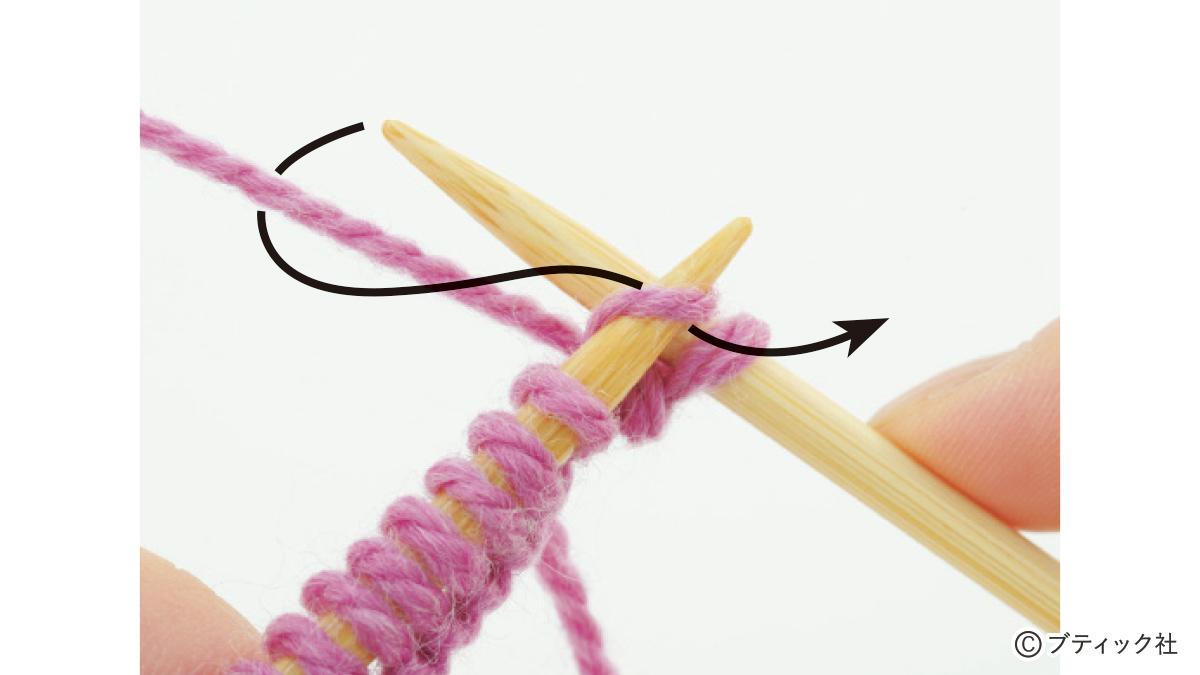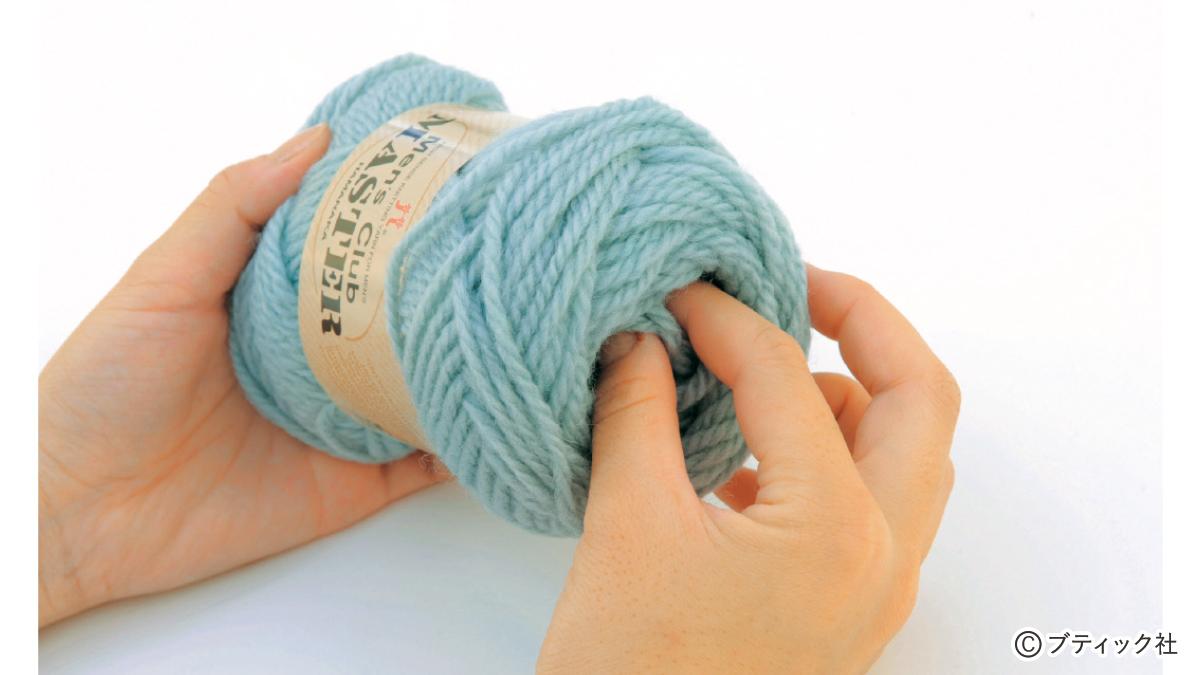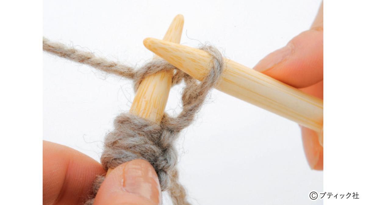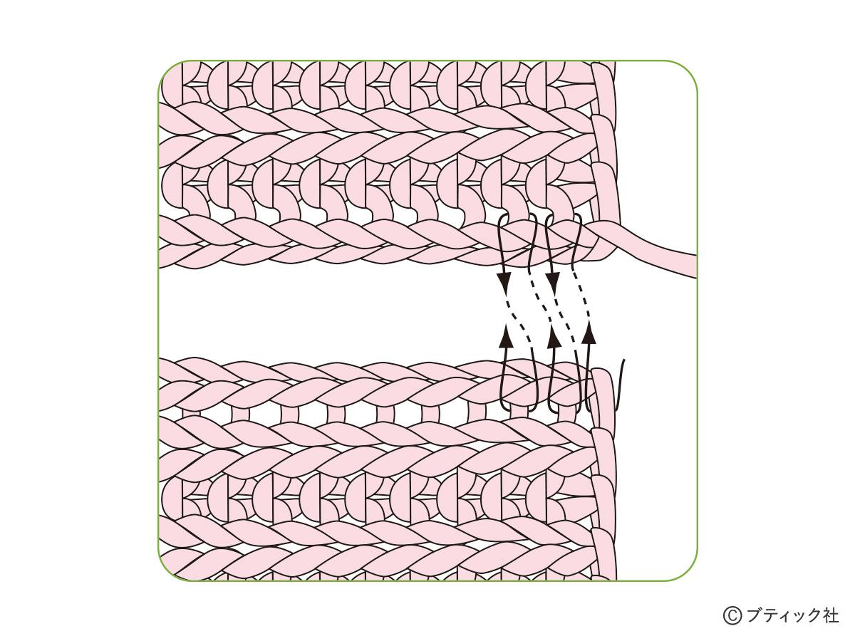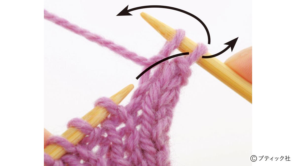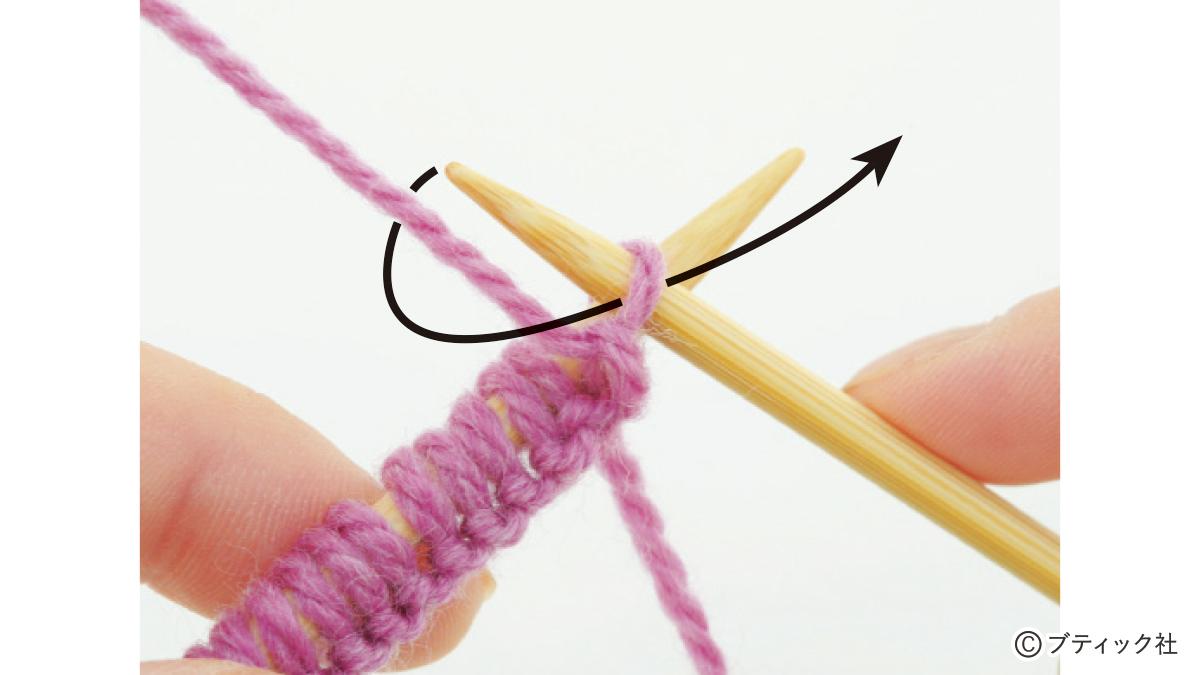 1つの段で、表目と裏目を1目ごとに交互に編んでいくのが1目ゴム編みです。伸縮性がある編み地なので、手にフィットさせたいハンドウォーマーにぴったり。往復編みした編み地の左右両端をとじて筒状にしますが、親指を出す穴を残しておくのがポイント。