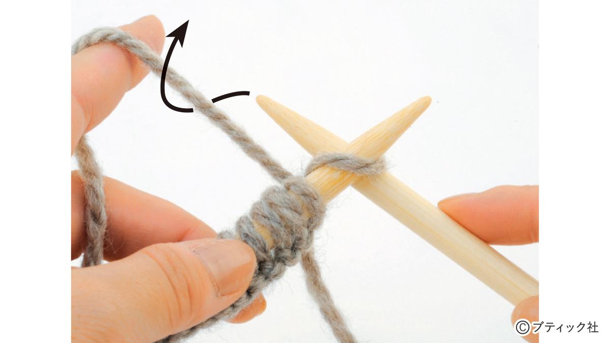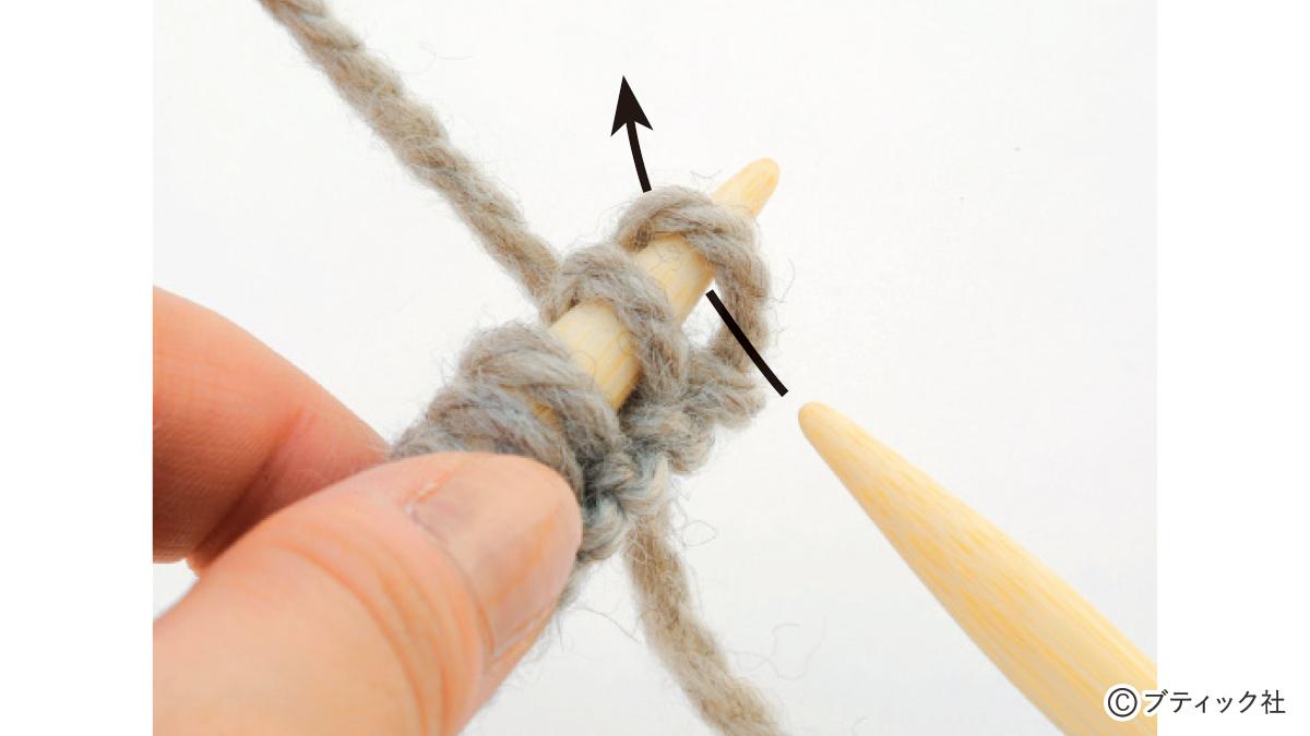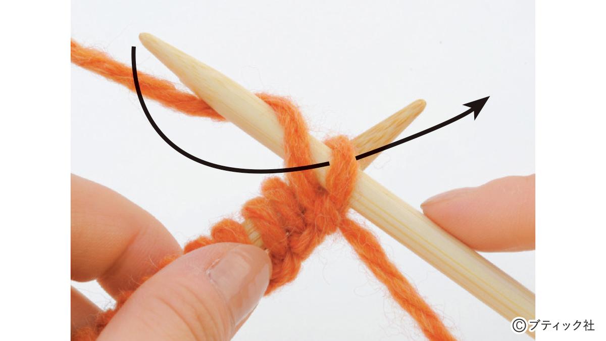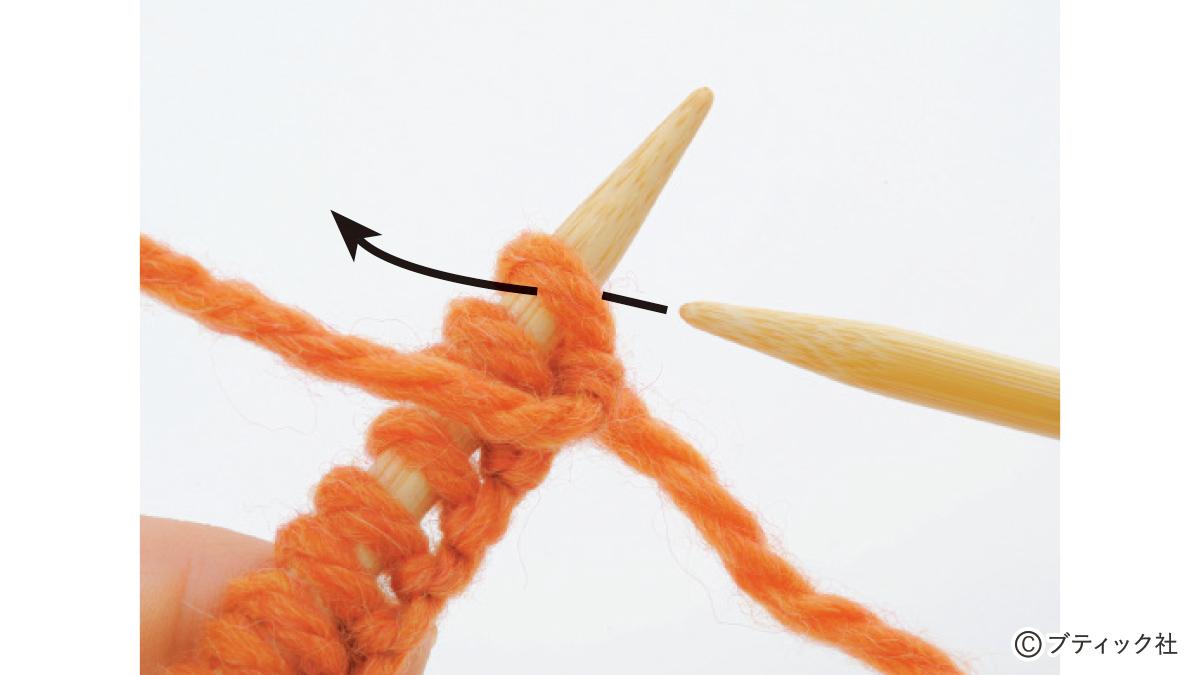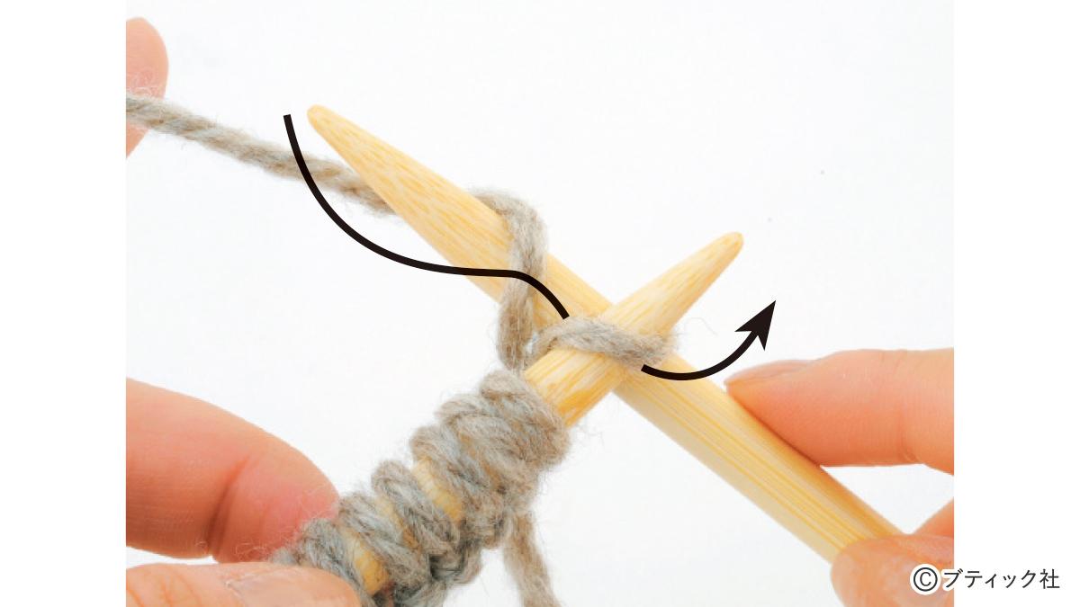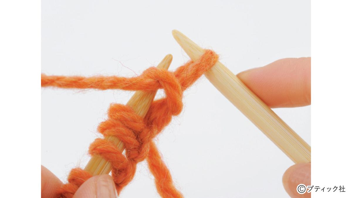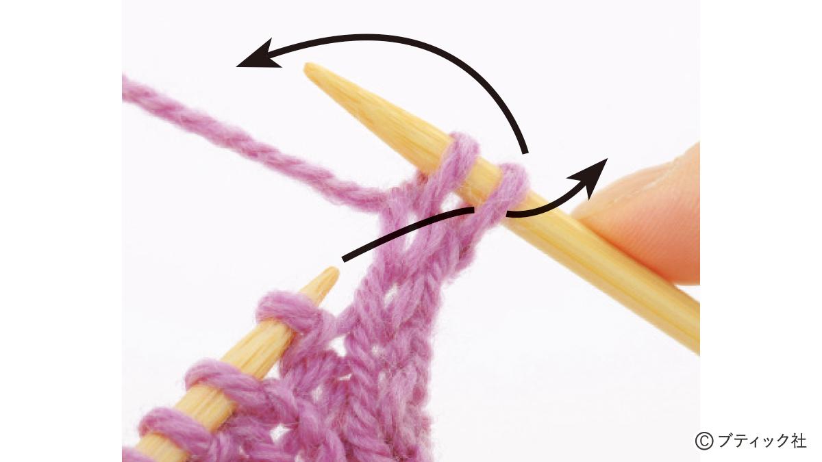 1つの段で、表目と裏目を1目ごとに交互に編んでいくのが1目ゴム編みです。伸縮性がある編み地なので、手にフィットさせたいハンドウォーマーにぴったり。往復編みした編み地の左右両端をとじて筒状にしますが、親指を出す穴を残しておくのがポイント。
