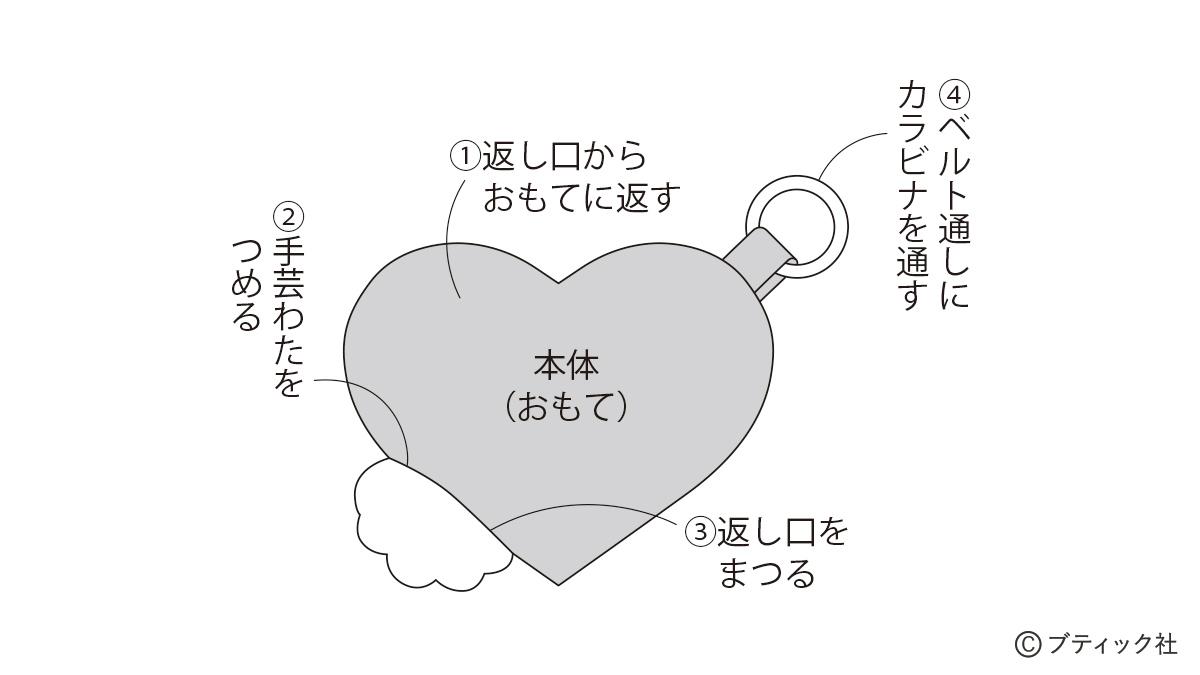 手芸わたをを入れてふっくらとさせたハート型のチャームです。カラビナをつけるループにはジーンズのベルト通しを使って。お好みで金具を替えて使いましょう!